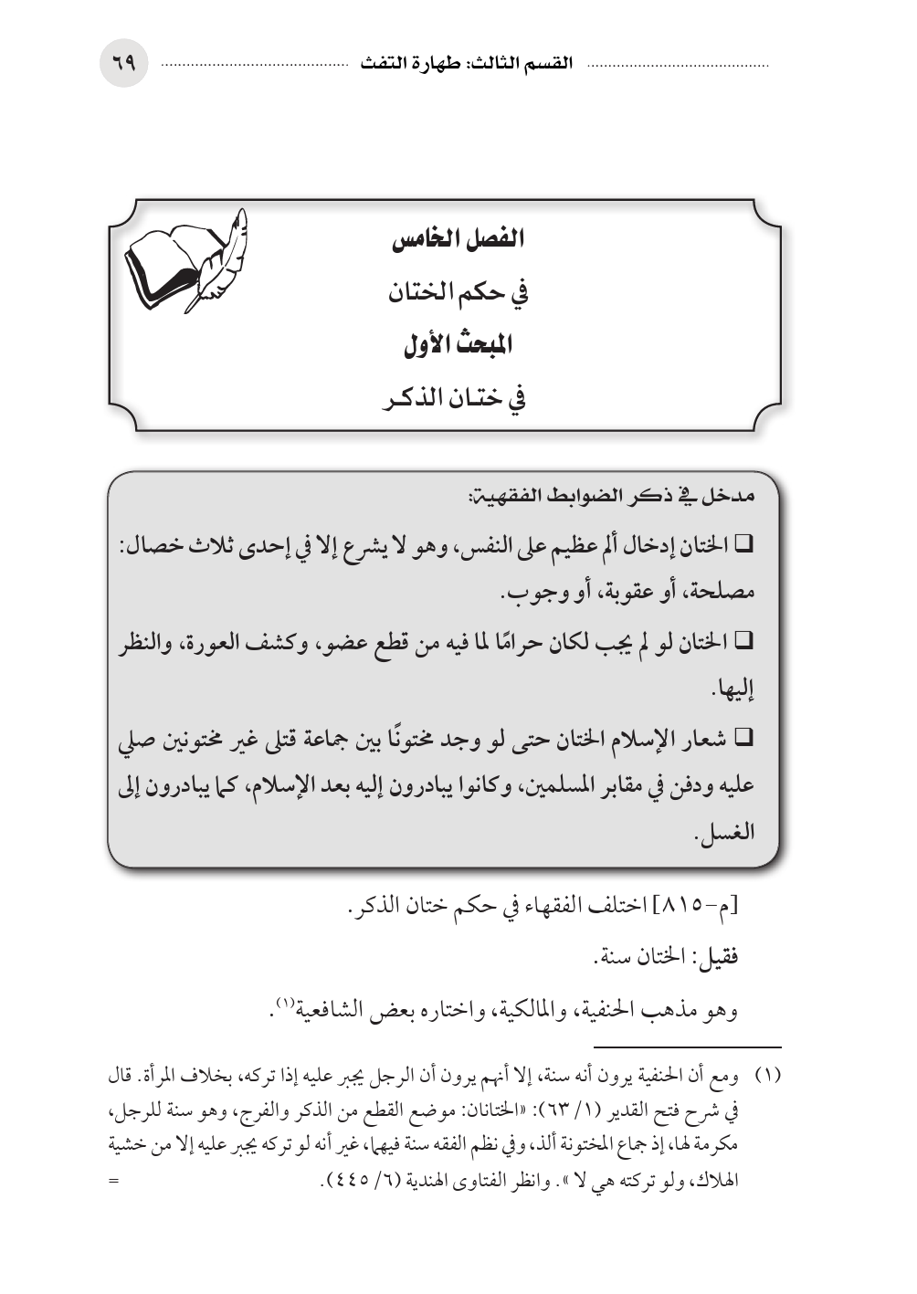 (¬١) ومع أن الحنفية يرون أنه سنة، إلا أنهم يرون أن الرجل يجبر عليه إذا تركه، بخلاف المرأة. قال في شرح فتح القدير (١/ ٦٣): «الختانان: موضع القطع من الذكر والفرج، وهو سنة للرجل، مكرمة لها، إذ جماع المختونة ألذ، وفي نظم الفقه سنة فيهما، غير أنه لو تركه يجبر عليه إلا من خشية الهلاك، ولو تركته هي لا». وانظر الفتاوى الهندية (٦/ ٤٤٥). ...