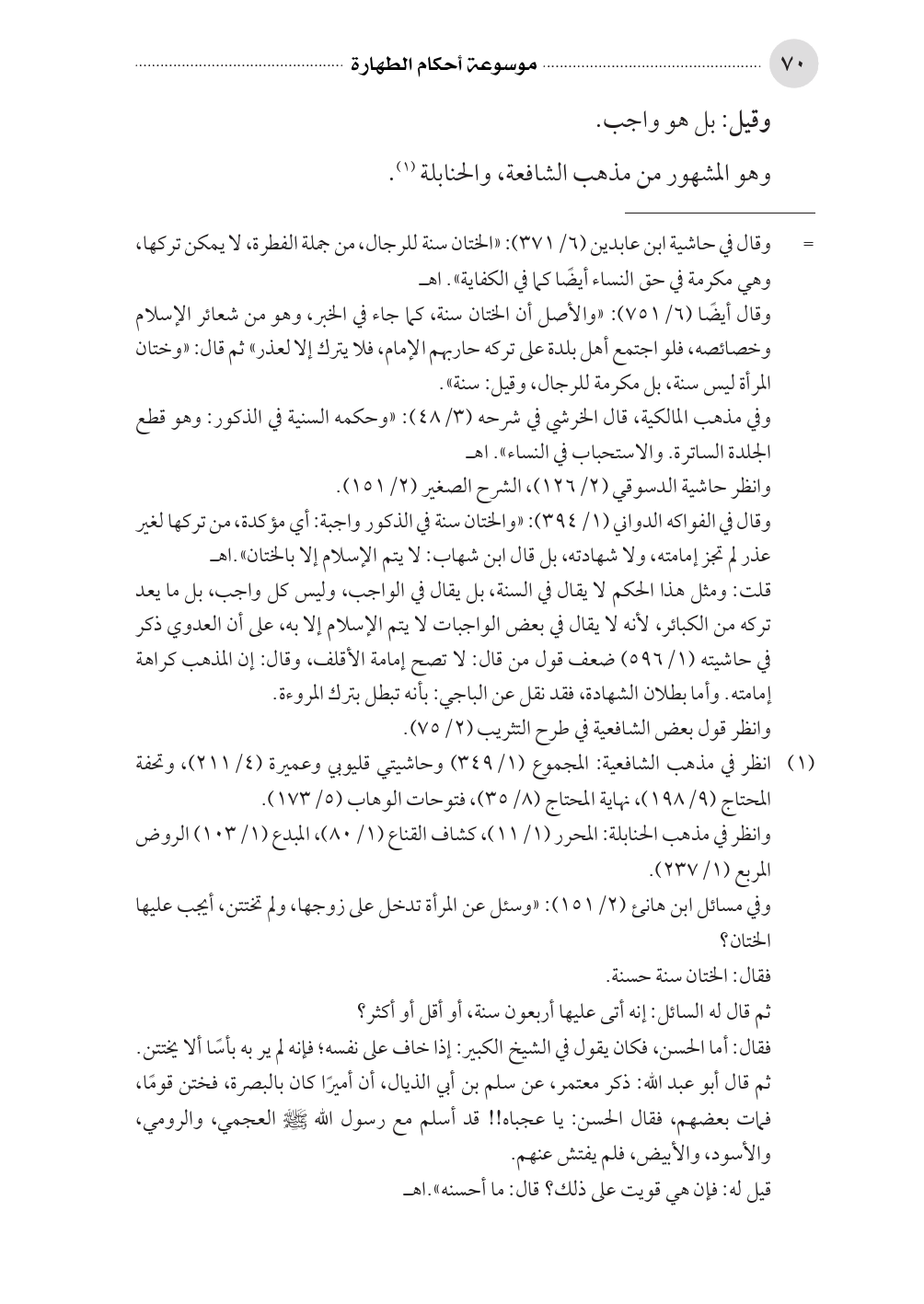 فقال: أما الحسن، فكان يقول في الشيخ الكبير: إذا خاف على نفسه؛ فإنه لم ير به بأسًا ألا يختتن. ثم قال أبو عبد الله: ذكر معتمر، عن سلم بن أبي الذيال، أن أميرًا كان بالبصرة، فختن قومًا، فمات بعضهم، فقال الحسن: يا عجباه! ! قد أسلم مع رسول الله صلى الله عليه وسلم العجمي، والرومي، والأسود، والأبيض، فلم يفتش عنهم.
