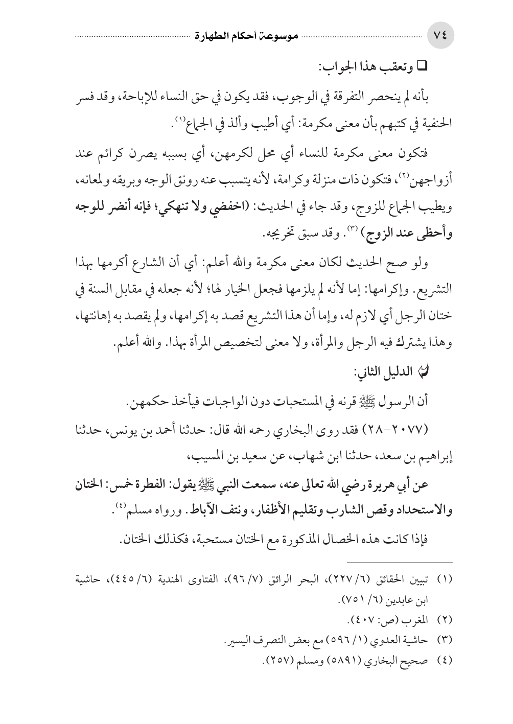 بأنه لم ينحصر التفرقة في الوجوب، فقد يكون في حق النساء للإباحة، وقد فسر الحنفية في كتبهم بأن معنى مكرمة: أي أطيب وألذ في الجماع (¬١).
