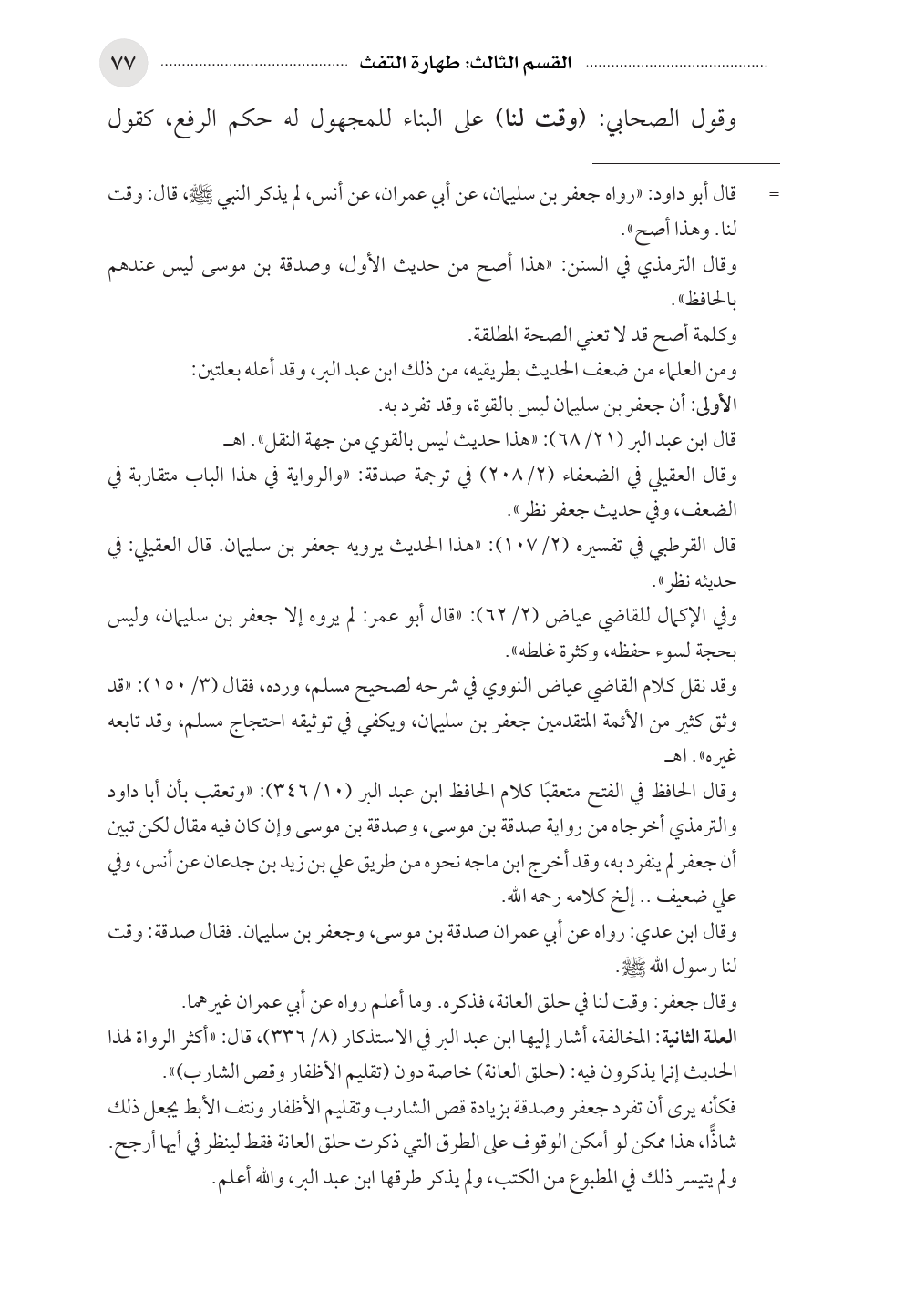 فكأنه يرى أن تفرد جعفر وصدقة بزيادة قص الشارب وتقليم الأظفار ونتف الأبط يجعل ذلك شاذًّا، هذا ممكن لو أمكن الوقوف على الطرق التي ذكرت حلق العانة فقط لينظر في أيها أرجح. ولم يتيسر ذلك في المطبوع من الكتب، ولم يذكر طرقها ابن عبد البر، والله أعلم.