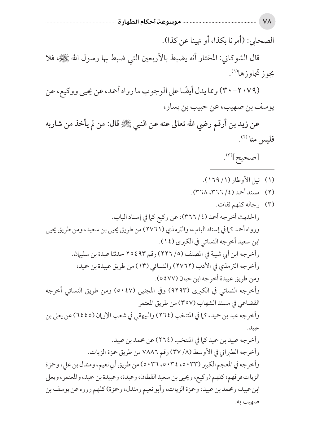 (٢٠٧٩ - ٣٠) ومما يدل أيضًا على الوجوب ما رواه أحمد، عن يحيى ووكيع، عن يوسف بن صهيب، عن حبيب بن يسار،