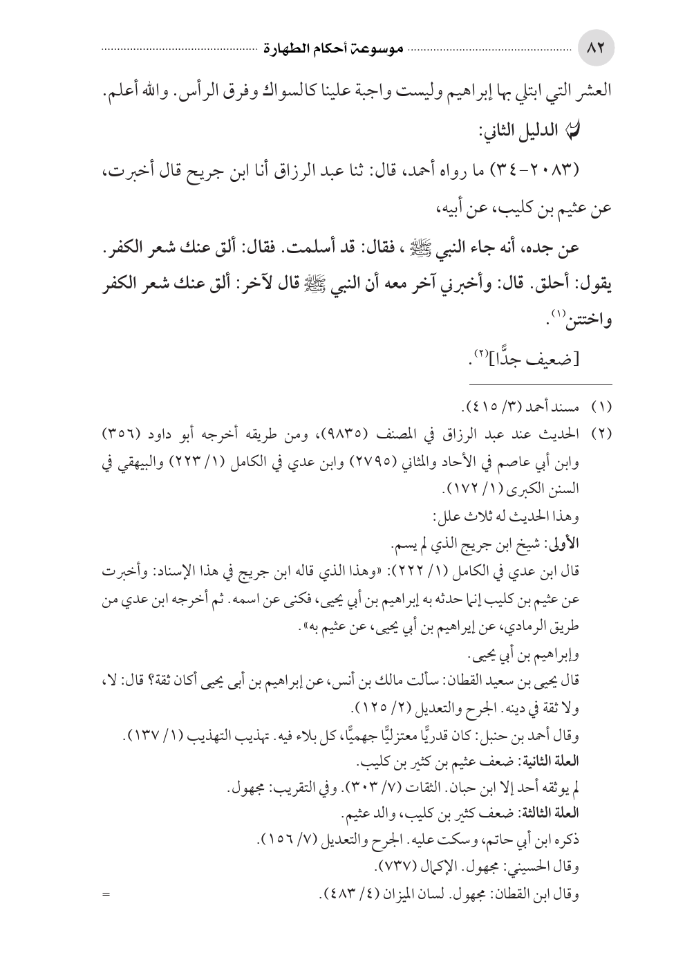 وللحديث شاهدان من حديث واثلة بن الأسقع وقتادة الرهاوي إلا أنهما في الاغتسال من الكفر، وليس فيهما الاختتان، ولذلك لن أشتغل بتخريجهما هنا، ولعلي أدرس أسانيدهما في كتاب الاغتسال إن شاء الله تعالى.