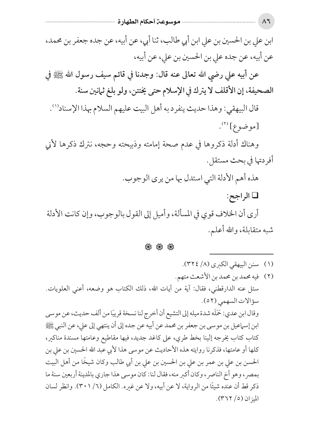عن أبيه علي رضي الله تعالى عنه قال: وجدنا في قائم سيف رسول الله صلى الله عليه وسلم في الصحيفة، إن الأقلف لا يترك في الإسلام حتى يختتن، ولو بلغ ثمانين سنة.