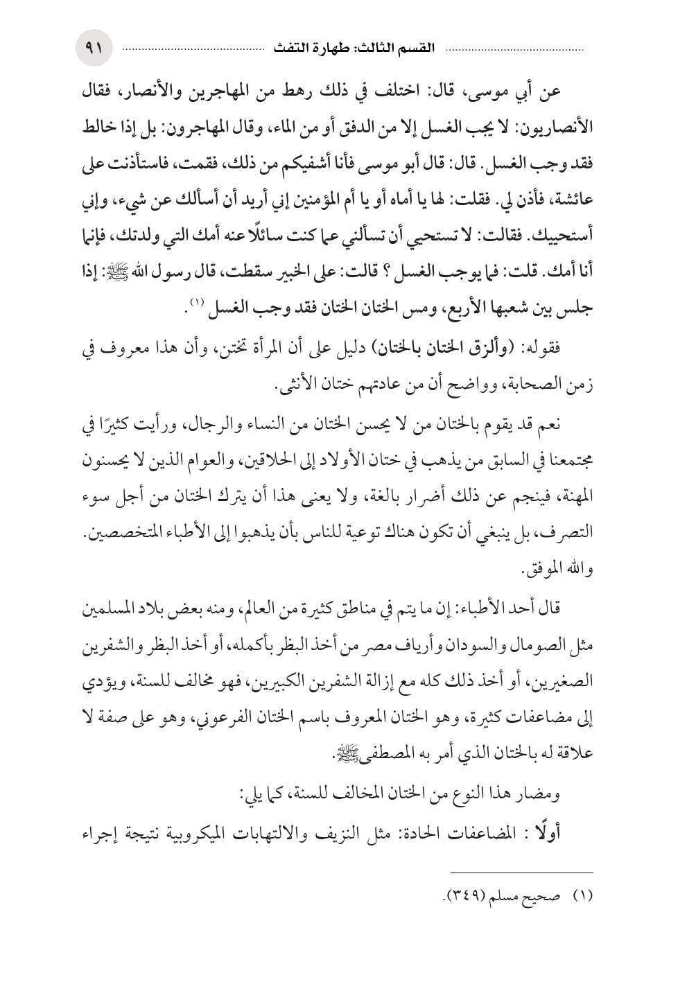عن أبي موسى، قال: اختلف في ذلك رهط من المهاجرين والأنصار، فقال الأنصاريون: لا يجب الغسل إلا من الدفق أو من الماء، وقال المهاجرون: بل إذا خالط فقد وجب الغسل. قال: قال أبو موسى فأنا أشفيكم من ذلك، فقمت، فاستأذنت على عائشة، فأذن لي. فقلت: لها يا أماه أو يا أم المؤمنين إني أريد أن أسألك عن شيء، وإني أستحييك. فقالت: لا تستحيي أن تسألني عما كنت سائلًا عنه أمك التي ولدتك، فإنما أنا أمك. قلت: فما يوجب الغسل؟ قالت: على الخبير سقطت، قال رسول الله صلى الله عليه وسلم: إذا جلس بين شعبها الأربع، ومس الختان الختان فقد وجب الغسل (¬١).
