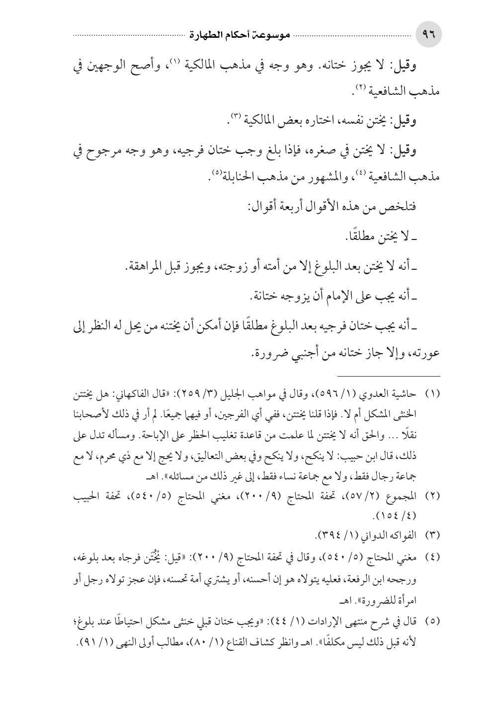 (¬٤) مغني المحتاج (٥/ ٥٤٠)، وقال في تحفة المحتاج (٩/ ٢٠٠): «قيل: يُخْتَن فرجاه بعد بلوغه، ورجحه ابن الرفعة، فعليه يتولاه هو إن أحسنه، أو يشتري أمة تحسنه، فإن عجز تولاه رجل أو امرأة للضرورة». اهـ