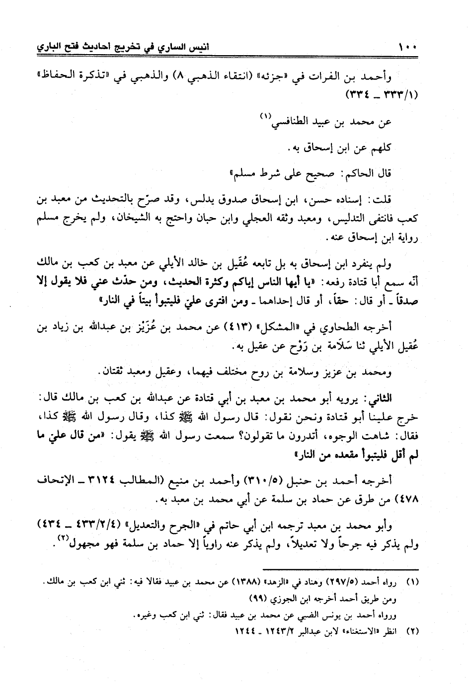 ولم ينفرد ابن إسحاق به بل تابعه عُقَيل بن خالد الأيلي عن معبد بن كعب بن مالك أنّه سمع أبا قتادة رفعه: "يا أيها الناس إياكم وكثرة الحديث، ومن حدّث عني فلا يقول إلا صدقاً -أو قال: حقاً، أو قال إحداهما- ومن افترى عليّ فليتبوأ بيتاً في النار"