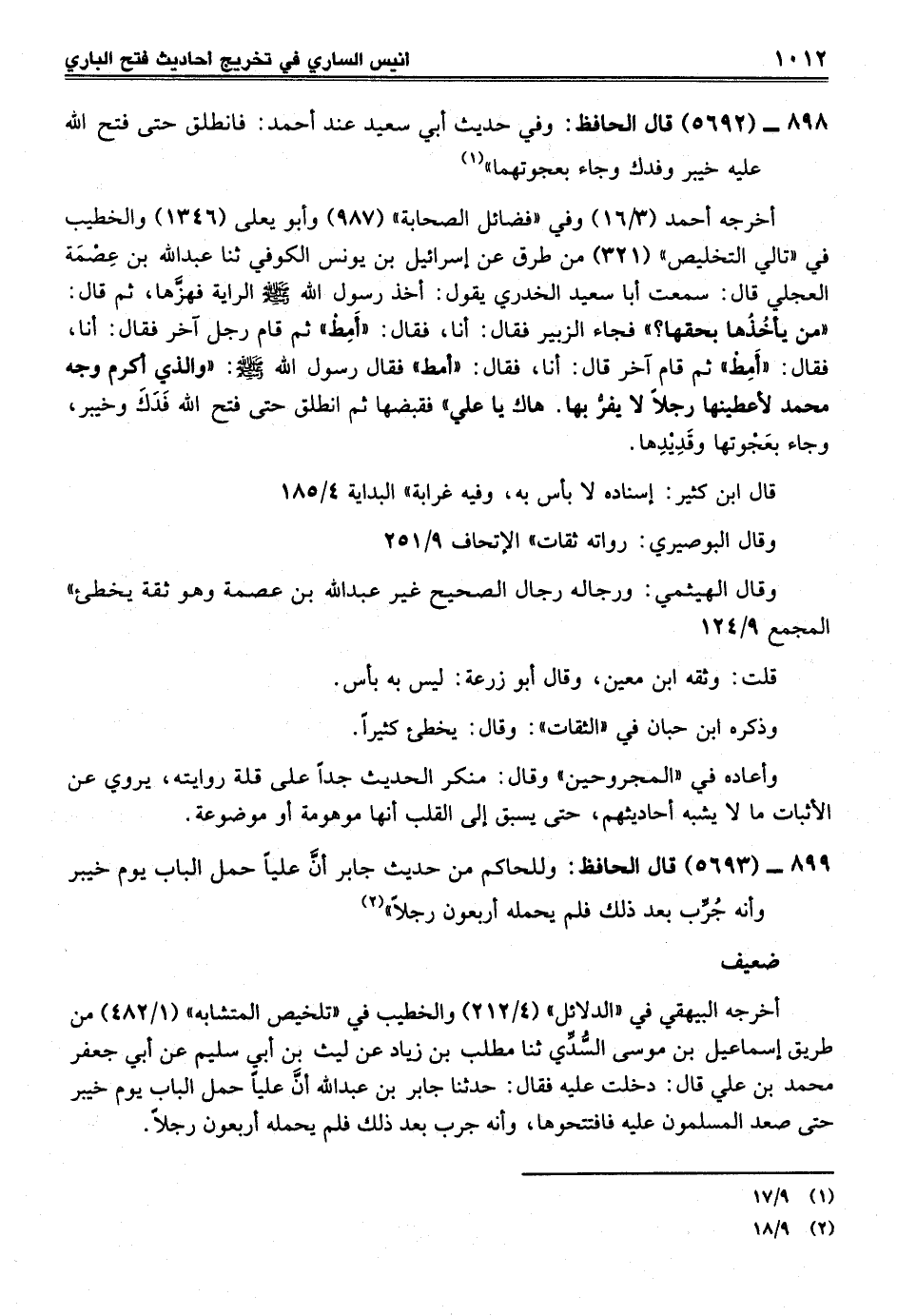 899 - (5693) قال الحافظ: وللحاكم من حديث جابر أنَّ علياً حمل الباب يوم خيبر وأنه جُرِّب بعد ذلك فلم يحمله أربعون رجلاً" (¬2)