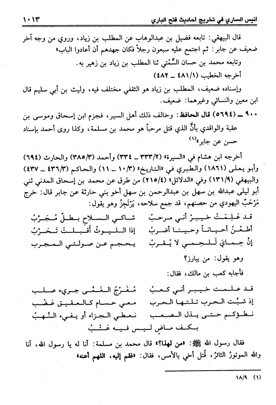 900 - (5694) قال الحافظ: وخالف ذلك أهل السير، فجزم ابن إسحاق وموسى بن عقبة والواقدي بأنَّ الذي قتل مرحباً هو محمد بن مسلمة، وكذا روى أحمد بإسناد حسن عن جابر" (¬1)