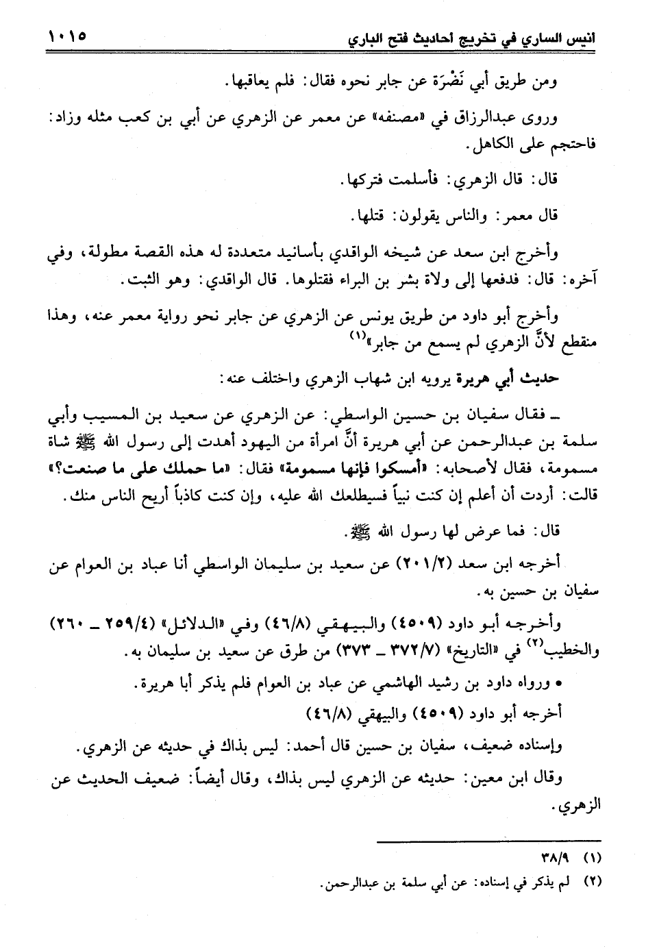 - فقال سفيان بن حسين الواسطي: عن الزهري عن سعيد بن المسيب وأبي سلمة بن عبد الرحمن عن أبي هريرة أنَّ امرأة من اليهود أهدت إلى رسول الله -صلى الله عليه وسلم- شاة مسمومة، فقال لأصحابه: "أمسكوا فإنها مسمومة" فقال: "ما حملك على ما صنعت؟ " قالت: أردت أن أعلم إن كنت نبياً فسيطلعك الله عليه، وإن كنت كاذباً أريح الناس منك.