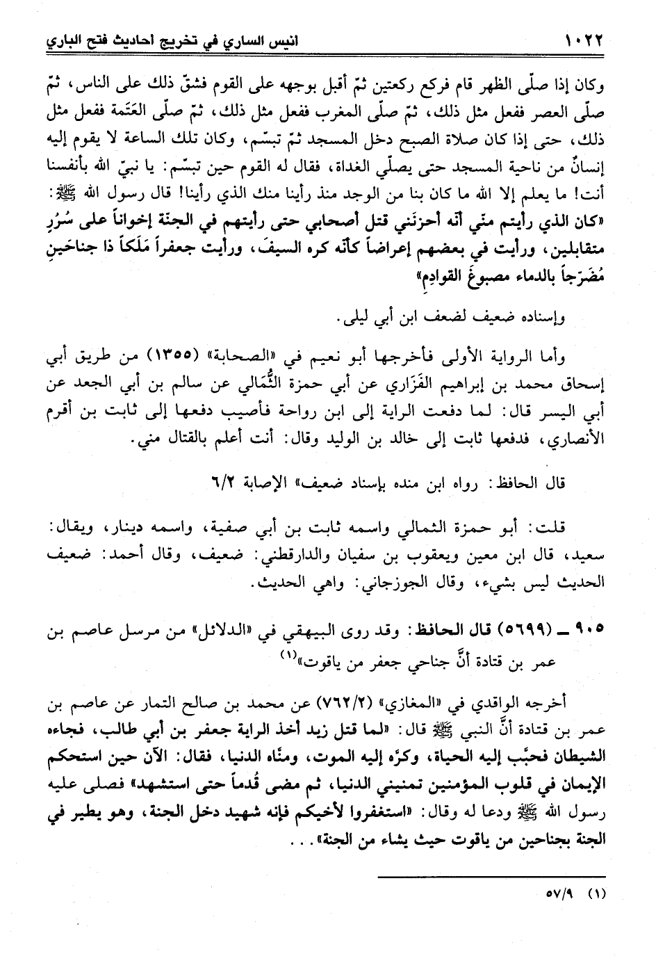 905 - (5699) قال الحافظ: وقد روى البيهقي في "الدلائل" من مرسل عاصم بن عمر بن قتادة أنَّ جناحي جعفر من ياقوت" (¬1)