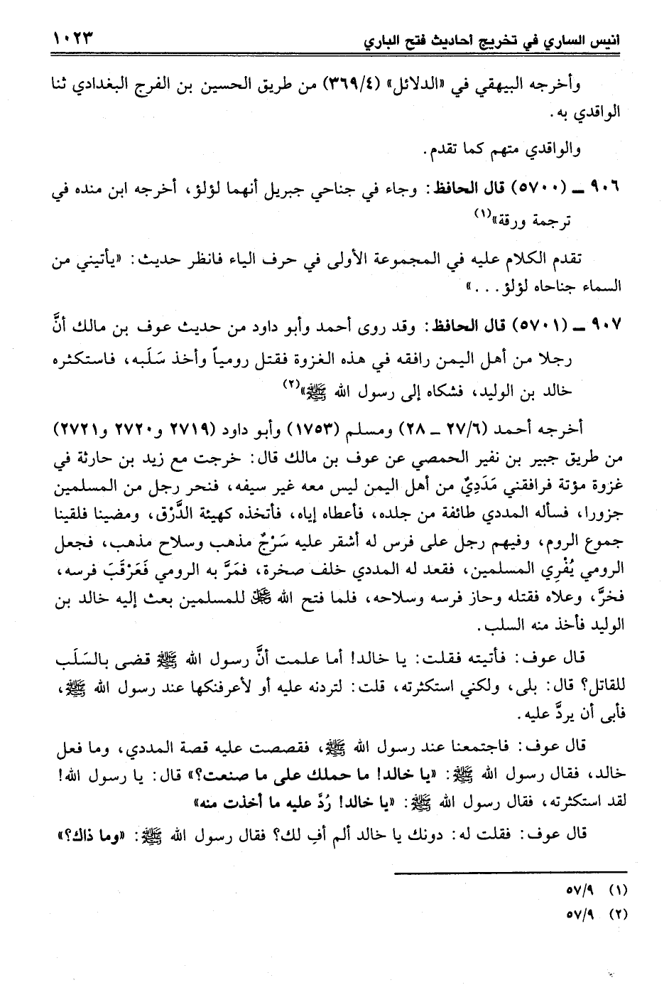 907 - (5701) قال الحافظ: وقد روى أحمد وأبو داود من حديث عوف بن مالك أنَّ رجلاً من أهل اليمن رافقه في هذه الغزوة فقتل رومياً وأخذ سَلَبه، فاستكثره خالد بن الوليد، فشكاه إلى رسول الله -صلى الله عليه وسلم-" (¬2)