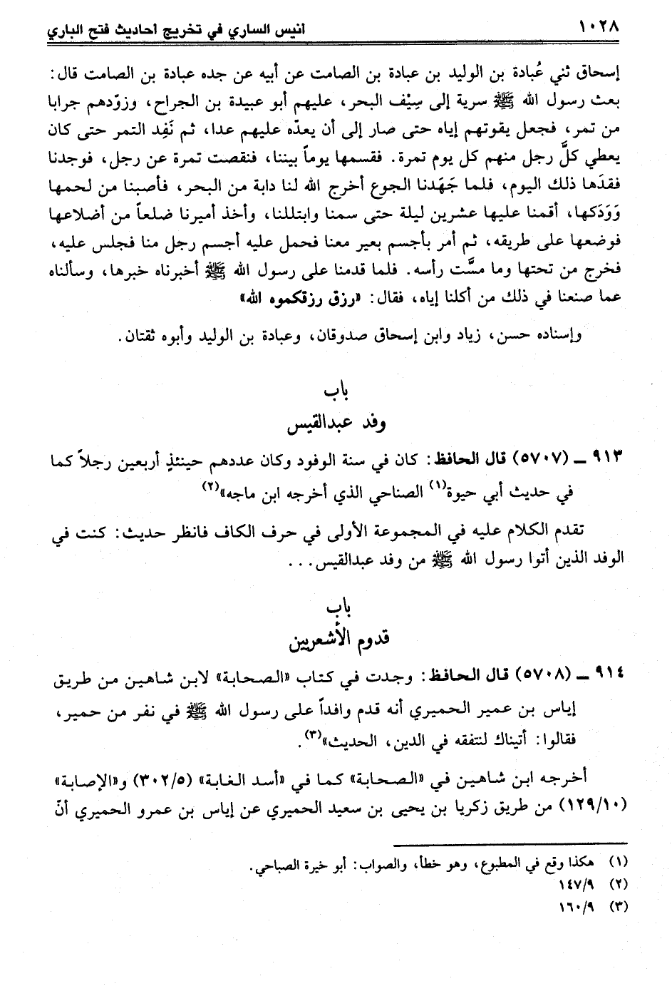 913 - (5707) قال الحافظ: كان في سنة الوفود وكان عددهم حينئذٍ أربعين رجلاً كما في حديث أبي حيوة (¬1) الصناحي الذي أخرجه ابن ماجه" (¬2)