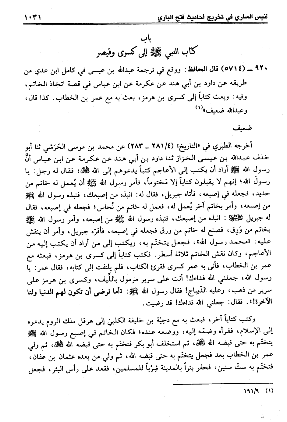 920 - (5714) قال الحافظ: ووقع في ترجمة عبد الله بن عيسى في كامل ابن عدي من طريقه عن داود بن أبي هند عن عكرمة عن ابن عباس في قصة اتخاذ الخاتم، وفيه: وبعث كتاباً إلى كسرى بن هرمز، بعث به مع عمر بن الخطاب. كذا قال، وعبد الله ضعيف" (¬1)