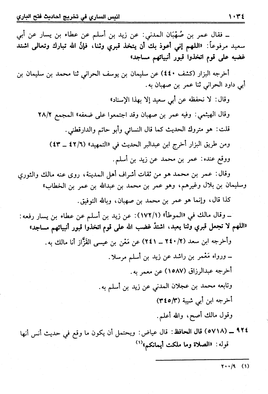 - فقال عمر بن صُهْبَان المدني: عن زيد بن أسلم عن عطاء بن يسار عن أبي سعيد مرفوعاً: "اللهم إني أعوذ بك أن يتخذ قبري وثنا، فإنَّ الله تبارك وتعالى اشتد غضبه على قوم اتخذوا قبور أنبيائهم مساجد"