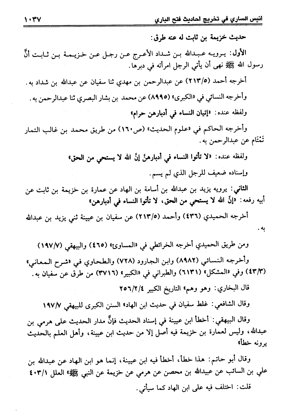 الأول: يرويه عبد الله بن شداد الأعرج عن رجل عن خزيمة بن ثابت أنَّ رسول الله -صلى الله عليه وسلم- نهى أن يأتي الرجل امرأته في دبرها.