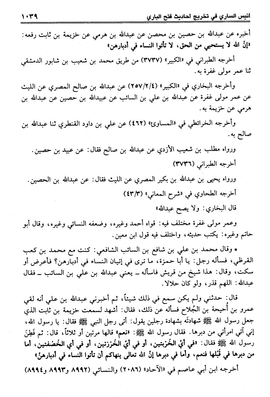 أخبره عن عبد الله بن حصين بن محصن عن عبد الله بن هرمى عن خزيمة بن ثابت رفعه: "إنَّ الله لا يستحيي من الحق، لا تأتوا النساء في أدبارهن"