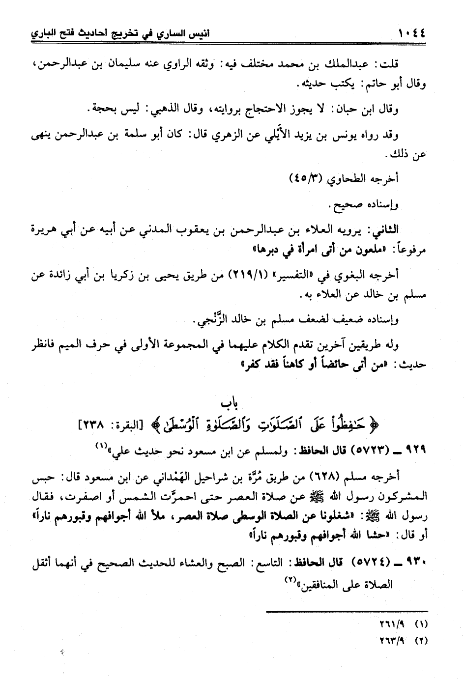 930 - (5724) قال الحافظ: التاسع: الصبح والعشاء للحديث الصحيح في أنهما أثقل الصلاة على المنافقين" (¬2)