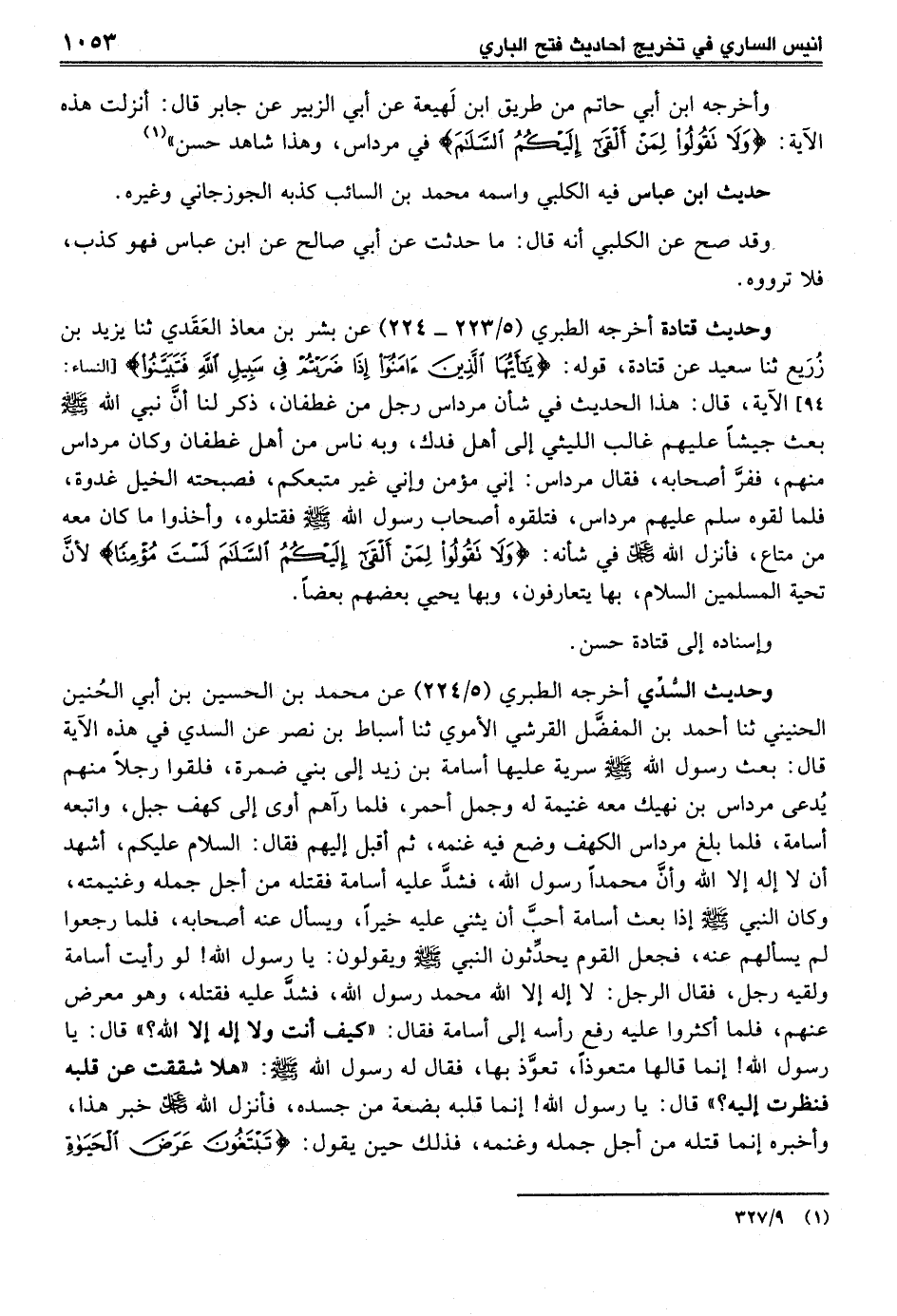 وحديث قتادة أخرجه الطبري (5/ 223 - 224) عن بشر بن معاذ العَقَدي ثنا يزيد بن زُرَيع ثنا سعيد عن قتادة، قوله: {يَا أَيُّهَا الَّذِينَ آمَنُوا إِذَا ضَرَبْتُمْ في سَبِيلِ اللهِ فَتَبَيَّنُوا} [النساء: 94] الآية، قال: هذا الحديث في شأن مرداس رجل من غطفان، ذكر لنا أنَّ نبي الله -صلى الله عليه وسلم- بعث جيشاً عليهم غالب الليثي إلى أهل فدك، وبه ناس من أهل غطفان وكان مرداس منهم، ففرَّ أصحابه، فقال مرداس: إني مؤمن وإني غير متبعكم، فصبحته الخيل غدوة، فلما لقوه سلم عليهم مرداس، فتلقوه أصحاب رسول الله -صلى الله عليه وسلم- فقتلوه، وأخذوا ما كان معه من متاع، فأنزل الله عز وجل في شأنه: {وَلَا تَقُولُوا لِمَنْ أَلْقَى إِلَيْكُمُ السَّلَامَ لَسْتَ مُؤْمِنًا} لأنَّ تحية المسلمين السلام، بها يتعارفون، وبها يحيى بعضهم بعضاً.