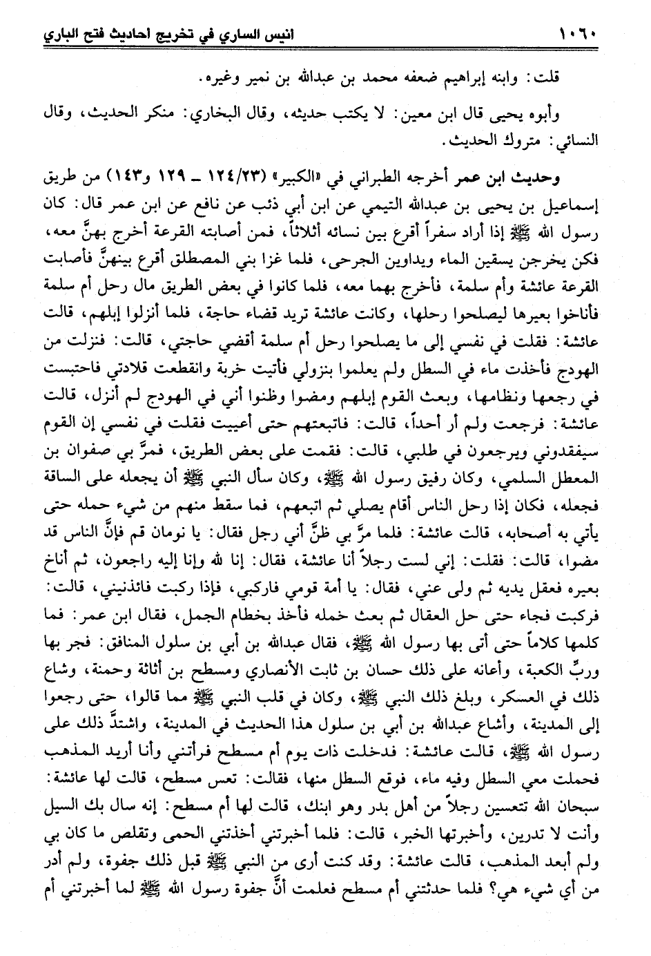 وحديث ابن عمر أخرجه الطبراني في "الكبير" (23/ 124 - 129 و143) من طريق إسماعيل بن يحيى بن عبد الله التيمي عن ابن أبي ذئب عن نافع عن ابن عمر قال: كان رسول الله -صلى الله عليه وسلم- إذا أراد سفراً أقرع بين نسائه أثلاثاً، فمن أصابته القرعة أخرج بهنَّ معه، فكن يخرجن يسقين الماء ويداوين الجرحى، فلما غز ابني المصطلق أقرع بينهنَّ فأصابت القرعة عائشة وأم سلمة، فأخرج بهما معه، فلما كانوا في بعض الطريق مال رحل أم سلمة فأناخوا بعيرها ليصلحوا رحلها، وكانت عائشة تريد قضاء حاجة، فلما أنزلوا إبلهم، قالت عائشة: فقلت في نفسي إلى ما يصلحوا رحل أم سلمة أقضي حاجتي، قالت: فنزلت من الهودج فأخذت ماء في السطل ولم يعلموا بنزولي فأتيت خربة وانقطعت قلادتي فاحتبست في رجعها ونظامها، وبعث القوم إبلهم ومضوا وظنوا أني في الهودج لم أنزل، قالت عائشة: فرجعت ولم أر أحداً، قالت: فاتبعتهم حتى أعييت فقلت في نفسي إن القوم سيفقدوني ويرجعون في طلبي، قالت: فقمت على بعض الطريق، فمرَّ بي صفوان بن المعطل السلمي، وكان رفيق رسول الله -صلى الله عليه وسلم-، وكان سأل النبي -صلى الله عليه وسلم- أن يجعله على الساقة فجعله، فكان إذا رحل الناس أقام يصلي ثم اتبعهم، فما سقط منهم من شيء حمله حتى يأتي به أصحابه، قالت عائشة: فلما مرَّ بي ظنَّ أني رجل فقال: يا نومان قم فإنَّ الناس قد مضوا، قالت: فقلت: إني لست رجلاً أنا عائشة، فقال: إنا لله وإنا إليه راجعون، ثم أناخ بعيره فعقل يديه ثم ولى عني، فقال: يا أمة قومي فاركبي، فإذا ركبت فائذنيني، قالت: فركبت فجاء حتى حل العقال ثم بعث خمله فأخذ بخطام الجمل، فقال ابن عمر: فما كلمها كلاماً حتى أتى بها رسول الله -صلى الله عليه وسلم-، فقال عبد الله بن أبي بن سلول المنافق: فجر بها وربِّ الكعبة، وأعانه على ذلك حسان بن ثابت الأنصاري ومسطح بن أثاثة وحمنة، وشاع ذلك في العسكر، وبلغ ذلك النبي -صلى الله عليه وسلم-، وكان في قلب النبي -صلى الله عليه وسلم- مما قالوا، حتى رجعوا إلى المدينة، وأشاع عبد الله بن أبي بن سلول هذا الحديث في المدينة، واشتدَّ ذلك على رسول الله -صلى الله عليه وسلم-، قالت عائشة: فدخلت ذات يوم أم مسطح فرأتني وأنا أريد المذهب فحملت معي السطل وفيه ماء، فوقع السطل منها، فقالت: تعس مسطح، قالت لها عائشة: سبحان الله تتعسين رجلاً من أهل بدر وهو ابنك، قالت لها أم مسطح: إنه سال بك السيل وأنت لا تدرين، وأخبرتها الخبر، قالت: فلما أخبرتني أخذتني الحمى وتقلص ما كان بي ولم أبعد المذهب، قالت عائشة: وقد كنت أرى من النبي -صلى الله عليه وسلم- قبل ذلك جفوة، ولم أدر من أي شيء هي؟ فلما حدثتني أم مسطح فعلمت أنَّ جفوة رسول الله -صلى الله عليه وسلم- لما أخبرتني أم