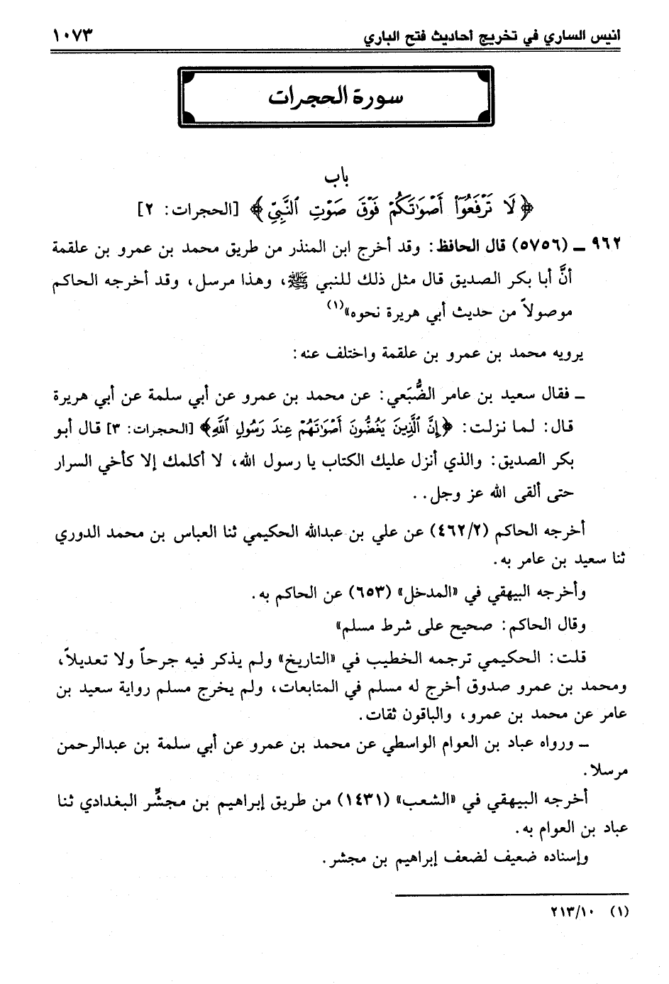 - فقال سعيد بن عامر الضُّبَعي: عن محمد بن عمرو عن أبي سلمة عن أبي هريرة قال: لما نزلت: {إِنَّ الَّذِينَ يَغُضُّونَ أَصْوَاتَهُمْ عِنْدَ رَسُولِ اللهِ} [الحجرات: 3] قال أبو بكر الصديق: والذي أنزل عليك الكتاب يا رسول الله، لا أكلمك إلا كأخي السرار حتى ألقى الله عز وجل ..