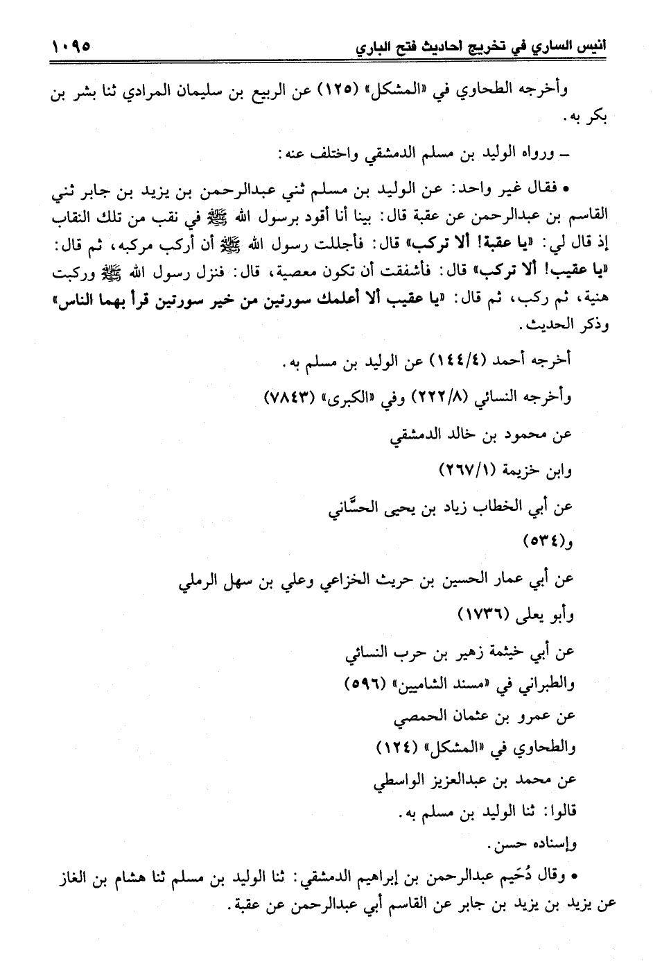 • فقال غير واحد: عن الوليد بن مسلم ثني عبد الرحمن بن يزيد بن جابر ثني القاسم بن عبد الرحمن عن عقبة قال: بينا أنا أقود برسول الله -صلى الله عليه وسلم- في نقب من تلك النقاب إذ قال لي: "يا عقبة! ألا تركب" قال: فأجللت رسول الله -صلى الله عليه وسلم- أن أركب مركبه، ثم قال: "يا عقيب! ألا تركب" قال: فأشفقت أن تكون معصية، قال: فنزل رسول الله -صلى الله عليه وسلم- وركبت هنية، ثم ركب، ثم قال: "يا عقيب ألا أعلمك سورتين من خير سورتين قرأ بهما الناس" وذكر الحديث.