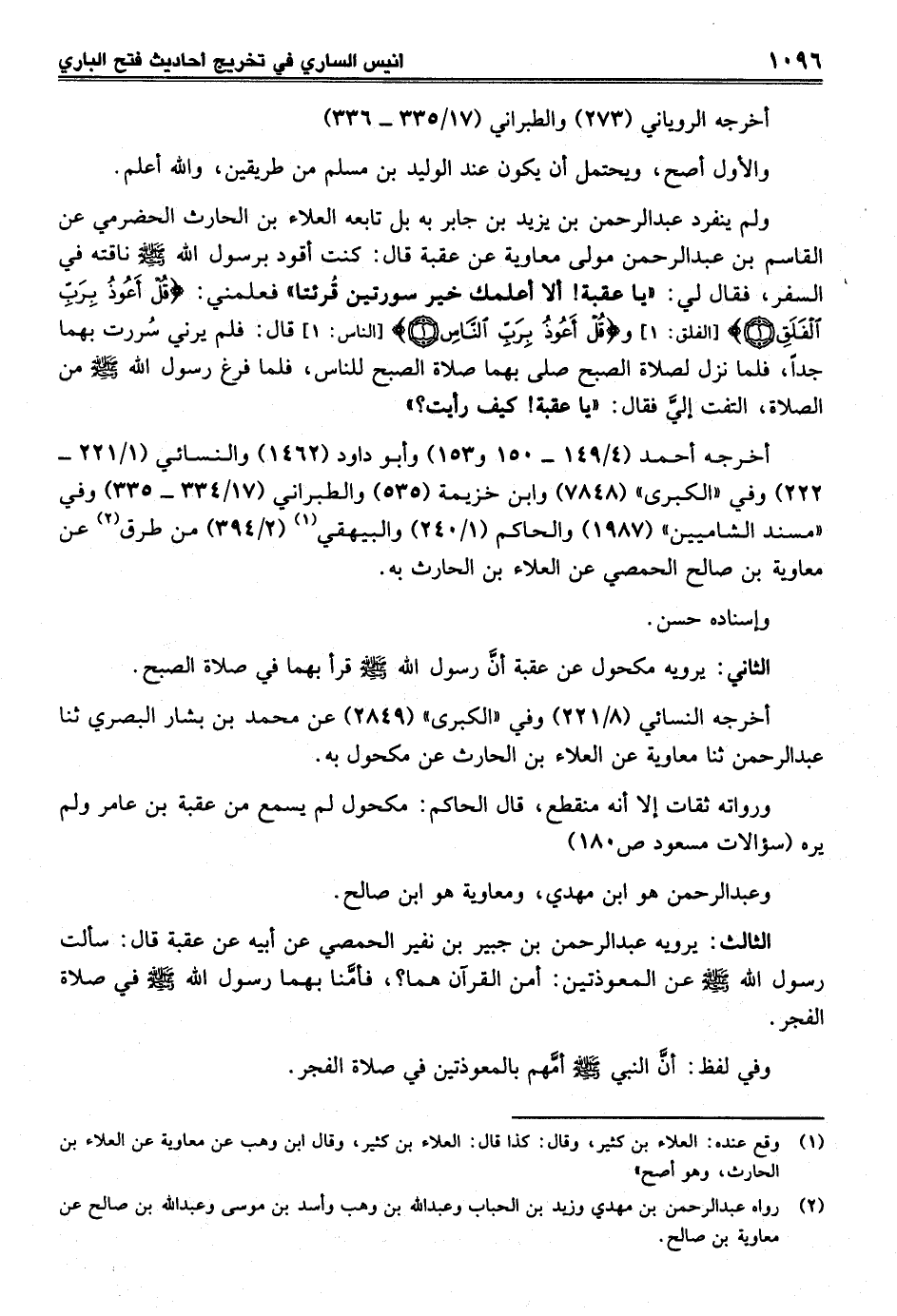 الثالث: يرويه عبد الرحمن بن جبير بن نفير الحمصي عن أبيه عن عقبة قال: سألت رسول الله -صلى الله عليه وسلم- عن المعوذتين: أمن القرآن هما؟، فأمَّنا بهما رسول الله -صلى الله عليه وسلم- في صلاة الفجر.