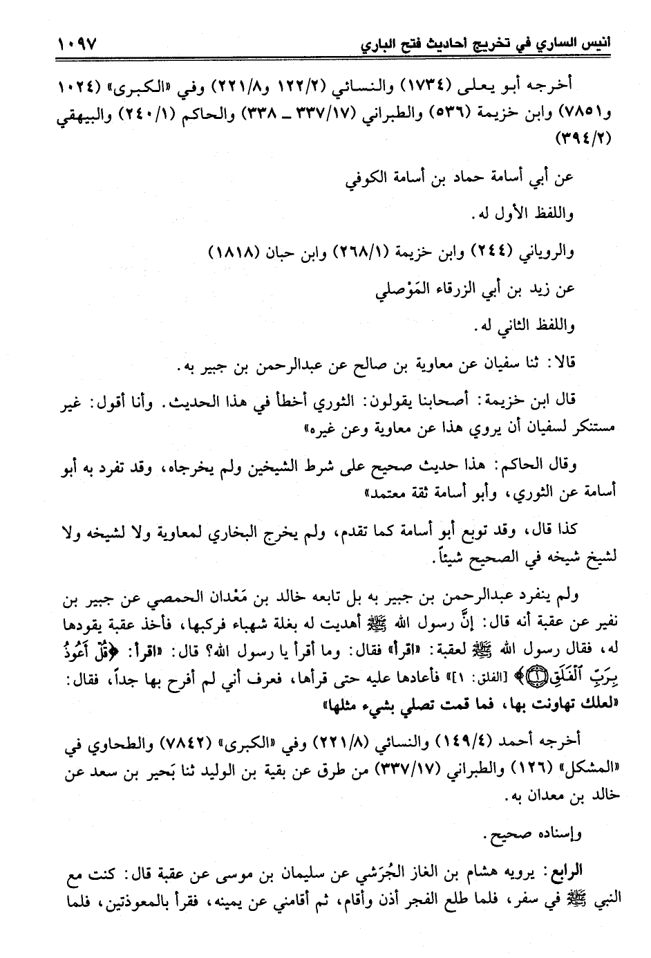 ولم ينفرد عبد الرحمن بن جبير به بل تابعه خالد بن مَعْدان الحمصي عن جبير بن نفير عن عقبة أنه قال: إنَّ رسول الله -صلى الله عليه وسلم- أهديت له بغلة شهباء فركبها، فأخذ عقبة يقودها له، فقال رسول الله -صلى الله عليه وسلم- لعقبة: "اقرأ" فقال: وما أقرأ يا رسول الله؟ قال: "اقرأ: {قُلْ أَعُوذُ بِرَبِّ الْفَلَقِ (1)} [الفلق: 1] " فأعادها عليه حتى قرأها، فعرف أني لم أفرح بها جداً، فقال: "لعلك تهاونت بها، فما قمت تصلي بشيء مثلها"