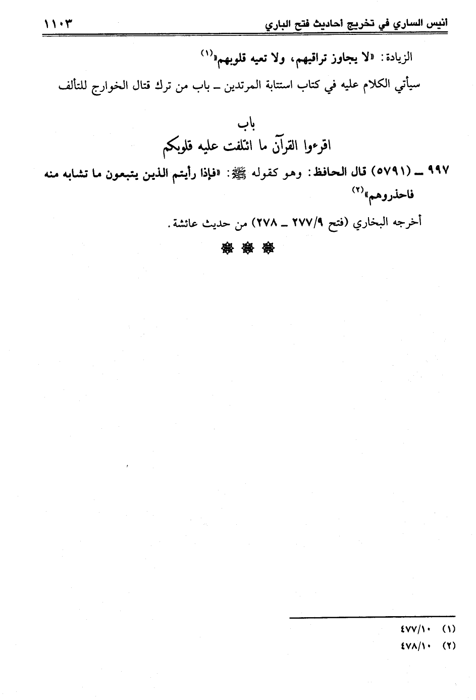 997 - (5791) قال الحافظ: وهو كقوله -صلى الله عليه وسلم-: "فإذا رأيتم الذين يتبعون ما تشابه منه فاحذروهم" (¬2)