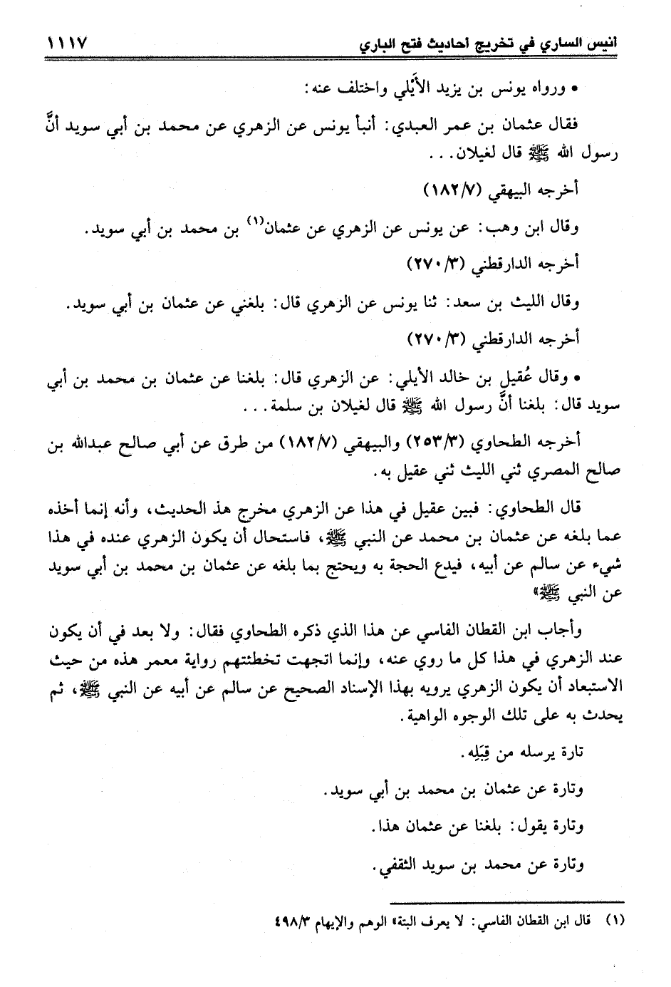 قال الطحاوي: فبين عقيل في هذا عن الزهري مخرج هذ الحديث، وأنه إنما أخذه عما بلغه عن عثمان بن محمد عن النبي -صلى الله عليه وسلم-، فاستحال أن يكون الزهري عنده في هذا شيء عن سالم عن أبيه، فيدع الحجة به ويحتج بما بلغه عن عثمان بن محمد بن أبي سويد عن النبي -صلى الله عليه وسلم-"
