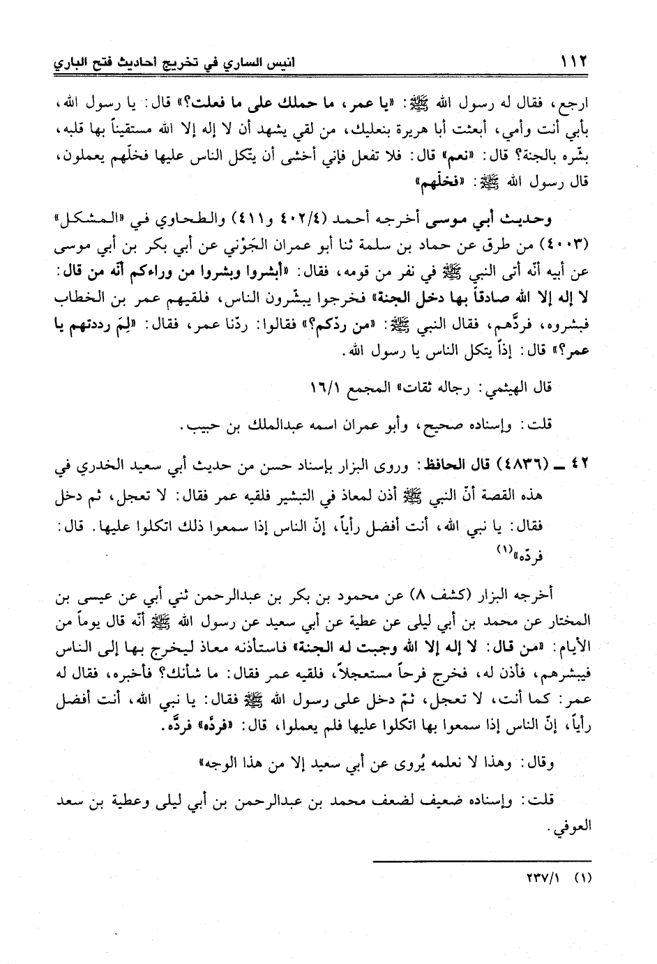 42 - (4836) قال الحافظ: وروى البزار بإسناد حسن من حديث أبي سعيد الخدري في هذه القصة أنّ النبي -صلى الله عليه وسلم- أذن لمعاذ في التبشير فلقيه عمر فقال: لا تعجل، ثم دخل فقال: يا نبي الله، أنت أفضل رأياً، إن الناس إذا سمعوا ذلك اتكلوا عليها. قال: فردّه" (¬1)