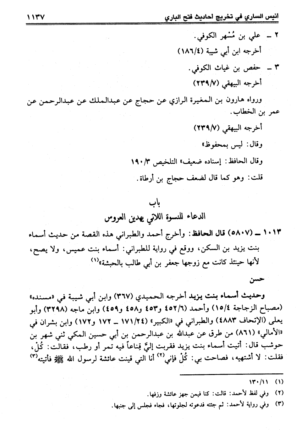 1013 - (5807) قال الحافظ: وأخرج أحمد والطبراني هذه القصة من حديث أسماء بنت يزيد بن السكن، ووقع في رواية للطبراني: أسماء بنت عميس، ولا يصح، لأنها حينئذ كانت مع زوجها جعفر بن أبي طالب بالحبشة" (¬1)