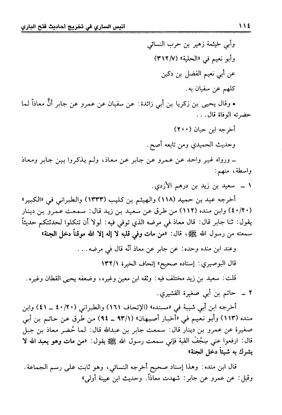أخرجه ابن أبي شيبة في "مسنده" (الإتحاف 161) والطبراني (20/ 40 - 41) وابن منده (113) وأبو نعيم في "أخبار أصبهان" (1/ 93 - 94) من طرق عن حاتم بن أبي صغيرة عن عمرو بن دينار قال: سمعت جابر بن عبد الله قال: لما حُضر معاذ بن جبل قال: ارفعوا عني سِجْفَ القبة فإني سمعت رسول الله -صلى الله عليه وسلم- يقول: "من مات وهو يعبد الله لا يشرك به شيئاً دخل الجنة"