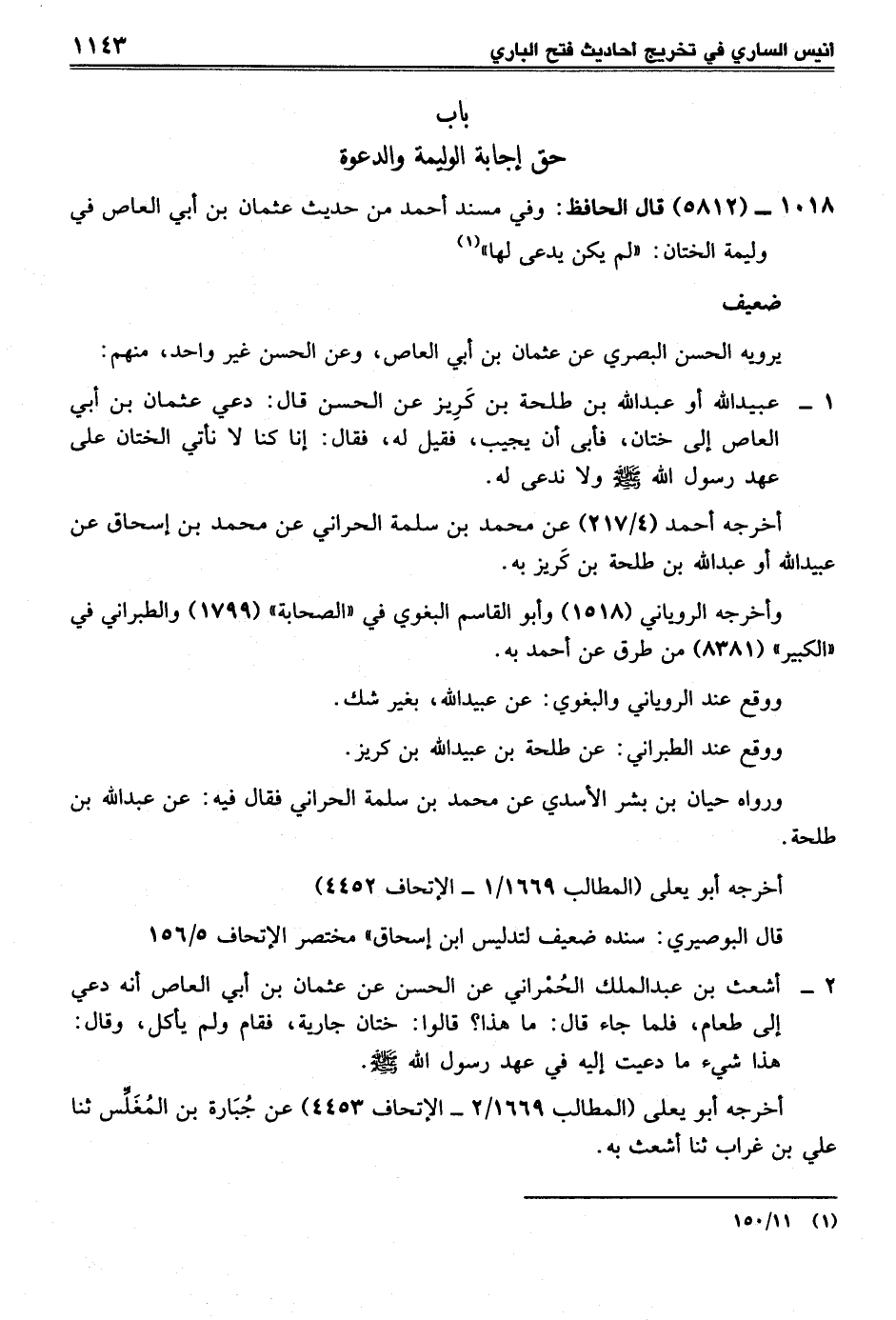 1018 - (5812) قال الحافظ: وفي مسند أحمد من حديث عثمان بن أبي العاص في وليمة الختان: "لم يكن يدعى لها" (¬1)