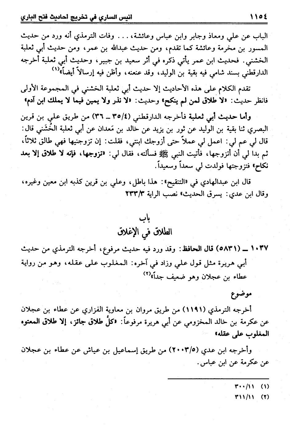 1037 - (5831) قال الحافظ: وقد ورد فيه حديث مرفوع، أخرجه الترمذي من حديث أبي هريرة مثل قول علي وزاد في آخره: المغلوب على عقله، وهو من رواية عطاء بن عجلان وهو ضعيف جداً" (¬2)
