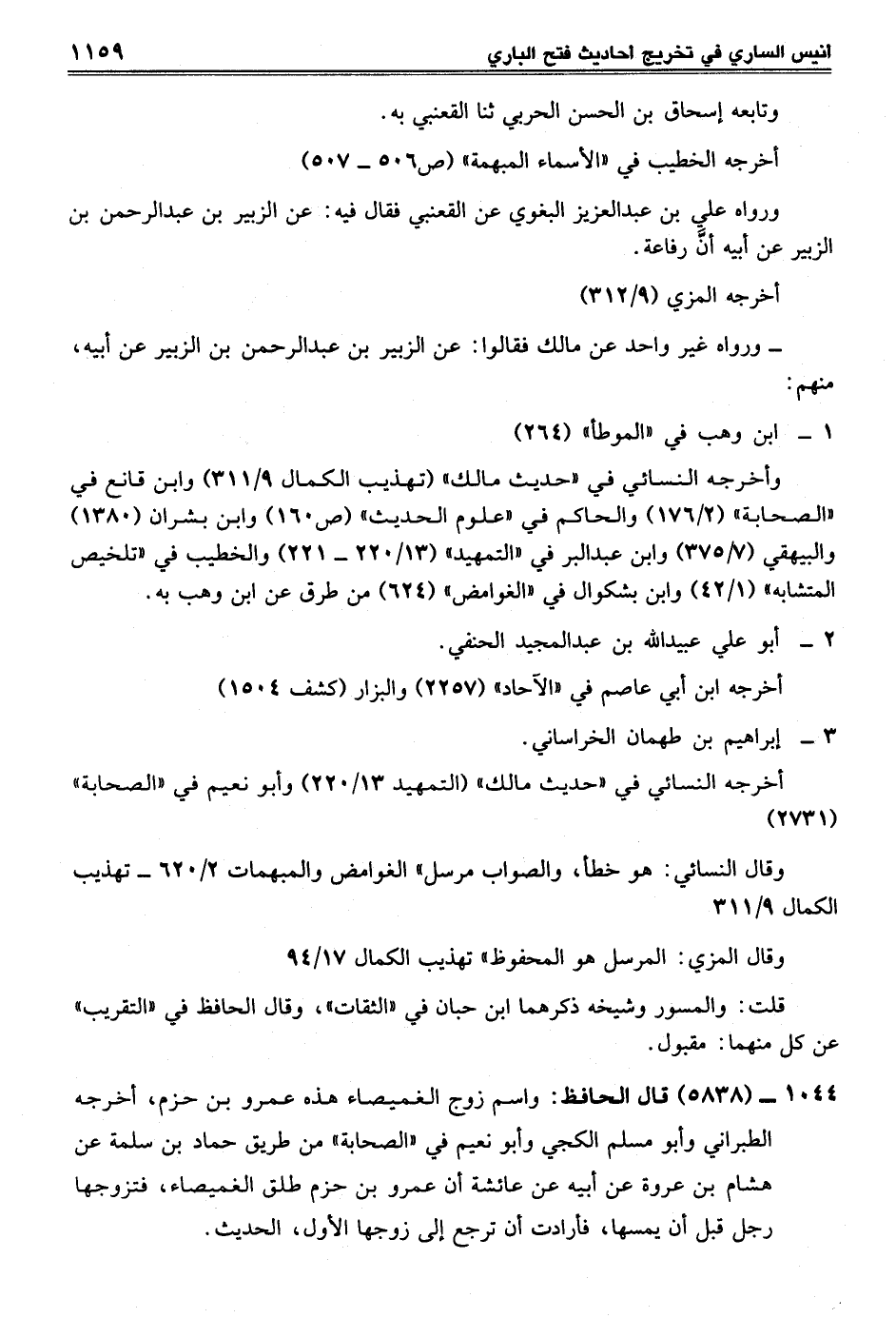 1044 - (5838) قال الحافظ: واسم زوج الغميصاء هذه عمرو بن حزم، أخرجه الطبراني وأبو مسلم الكجي وأبو نعيم في "الصحابة" من طريق حماد بن سلمة عن هشام بن عروة عن أبيه عن عائشة أن عمرو بن حزم طلق الغميصاء، فتزوجها رجل قبل أن يمسها، فأرادت أن ترجع إلى زوجها الأول، الحديث.