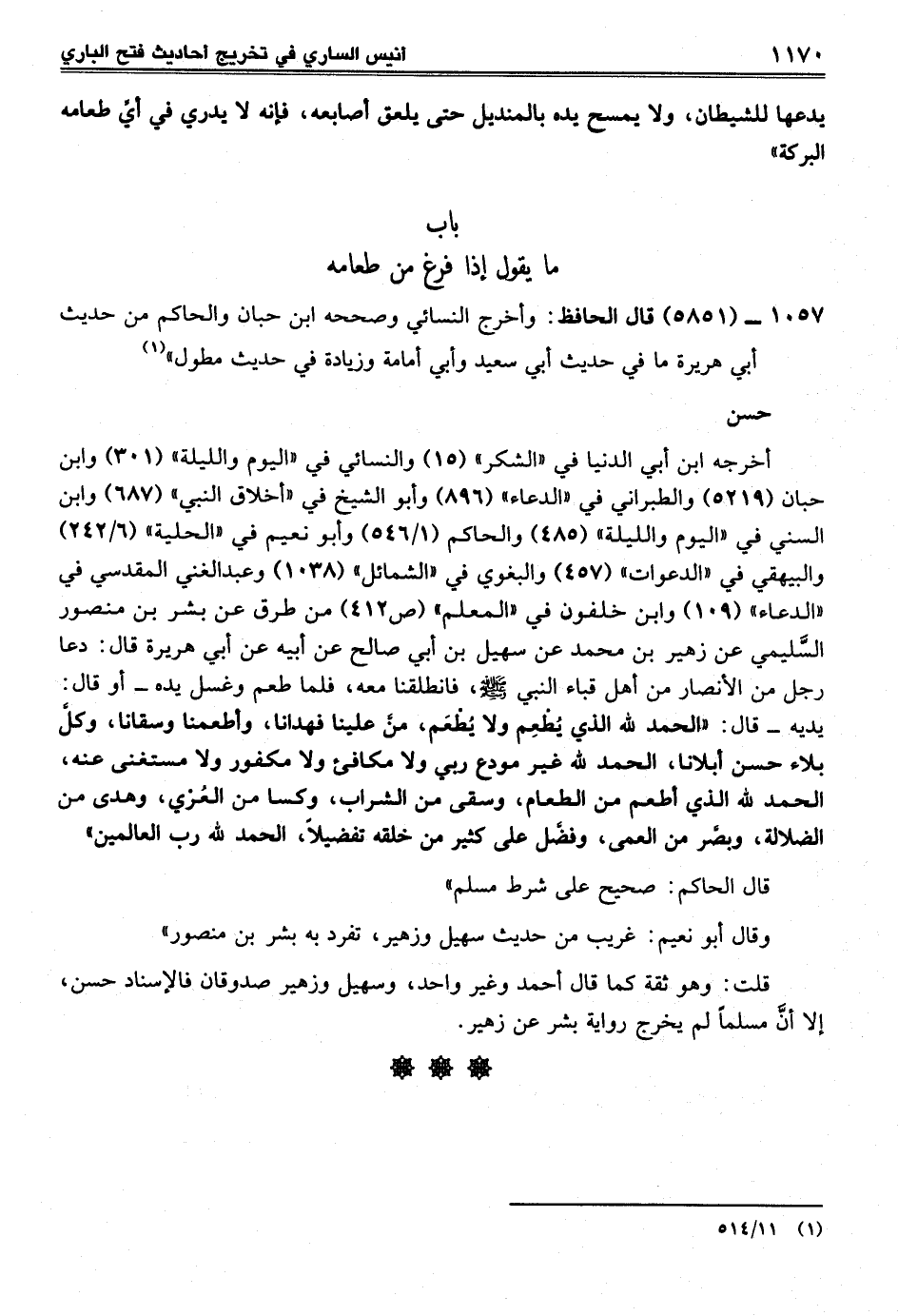 أخرجه ابن أبي الدنيا في "الشكر" (15) والنسائي في "اليوم والليلة" (301) وابن حبان (5219) والطبراني في "الدعاء" (896) وأبو الشيخ في "أخلاق النبي" (687) وابن السني في "اليوم والليلة" (485) والحاكم (1/ 546) وأبو نعيم في "الحلية" (6/ 242) والبيهقي في "الدعوات" (457) والبغوي في "الشمائل" (1038) وعبد الغني المقدسي في "الدعاء" (109) وابن خلفون في "المعلم" (ص 412) من طرق عن بشر بن منصور السَّليمي عن زهير بن محمد عن سهيل بن أبي صالح عن أبيه عن أبي هريرة قال: دعا رجل من الأنصار من أهل قباء النبي -صلى الله عليه وسلم-، فانطلقنا معه، فلما طعم وغسل يده -أو قال: يديه- قال: "الحمد لله الذي يُطْعِم ولا يُطْعَم، منَّ علينا فهدانا، وأطعمنا وسقانا، وكلَّ بلاء حسن أبلانا، الحمد لله غير مودع ربي ولا مكافىء ولا مكفور ولا مستغنى عنه، الحمد لله الذي أطعم من الطعام، وسقى من الشراب، وكسا من العُرْي، وهدى من الضلالة، وبصَّر من العمى، وفضَّل على كثير من خلقه تفضيلاً، الحمد لله رب العالمين"