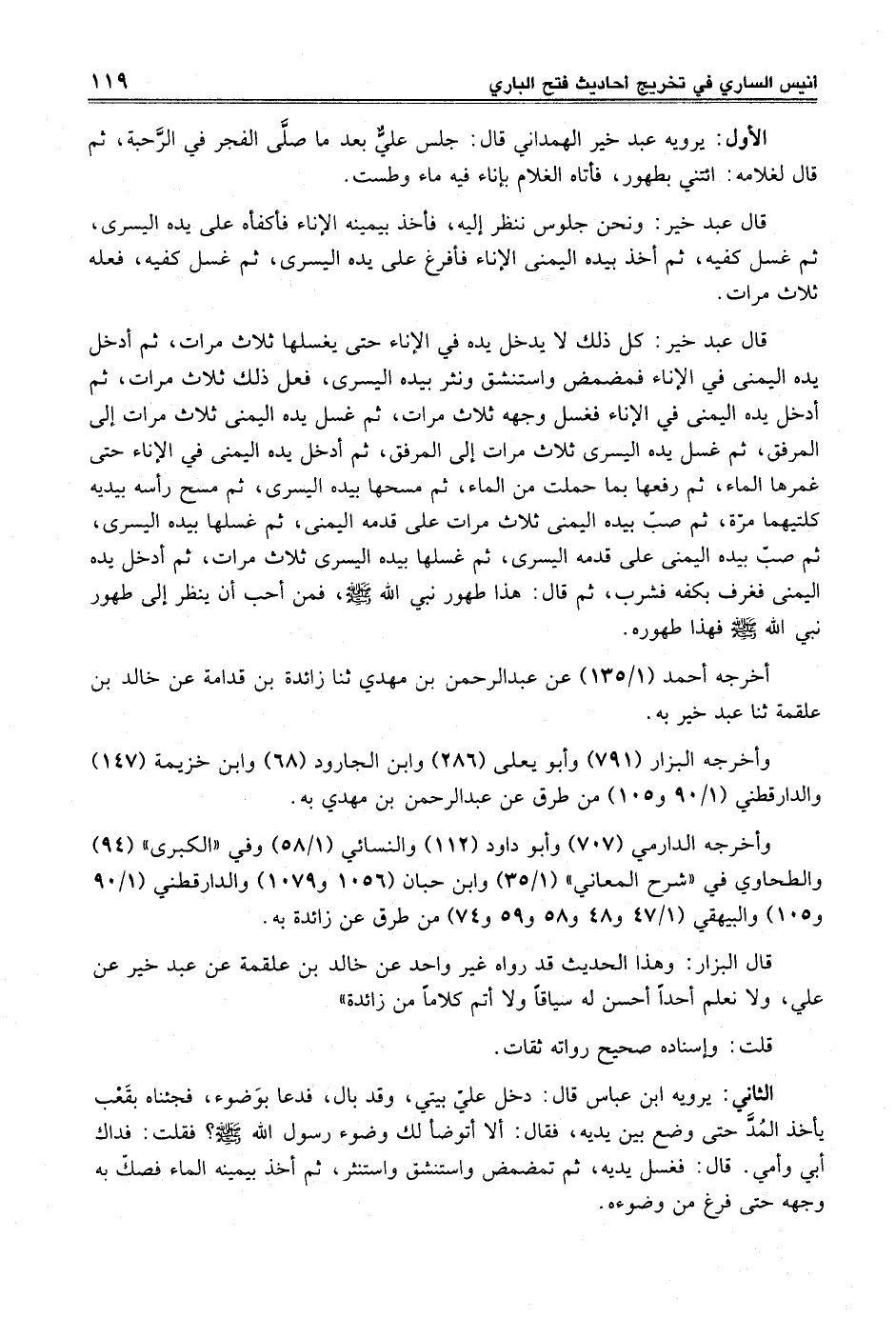 الأول: يرويه عبد خير الهمداني قال: جلس عليٌّ بعدما صلَّى الفجر في الرَّحبة، ثم قال لغلامه: ائتني بطهور، فأتاه الغلام بإناء فيه ماء وطست.