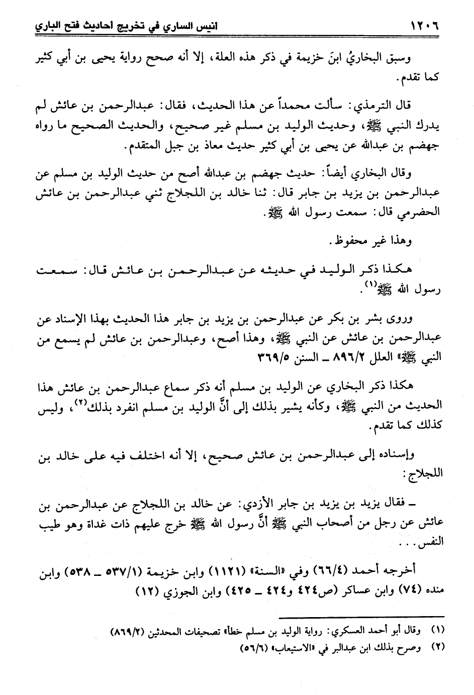 وقال البخاري أيضاً: حديث جهضم بن عبد الله أصح من حديث الوليد بن مسلم عن عبد الرحمن بن يزيد بن جابر قال: ثنا خالد بن اللجلاج ثني عبد الرحمن بن عائش الحضرمي قال: سمعت رسول الله -صلى الله عليه وسلم-.
