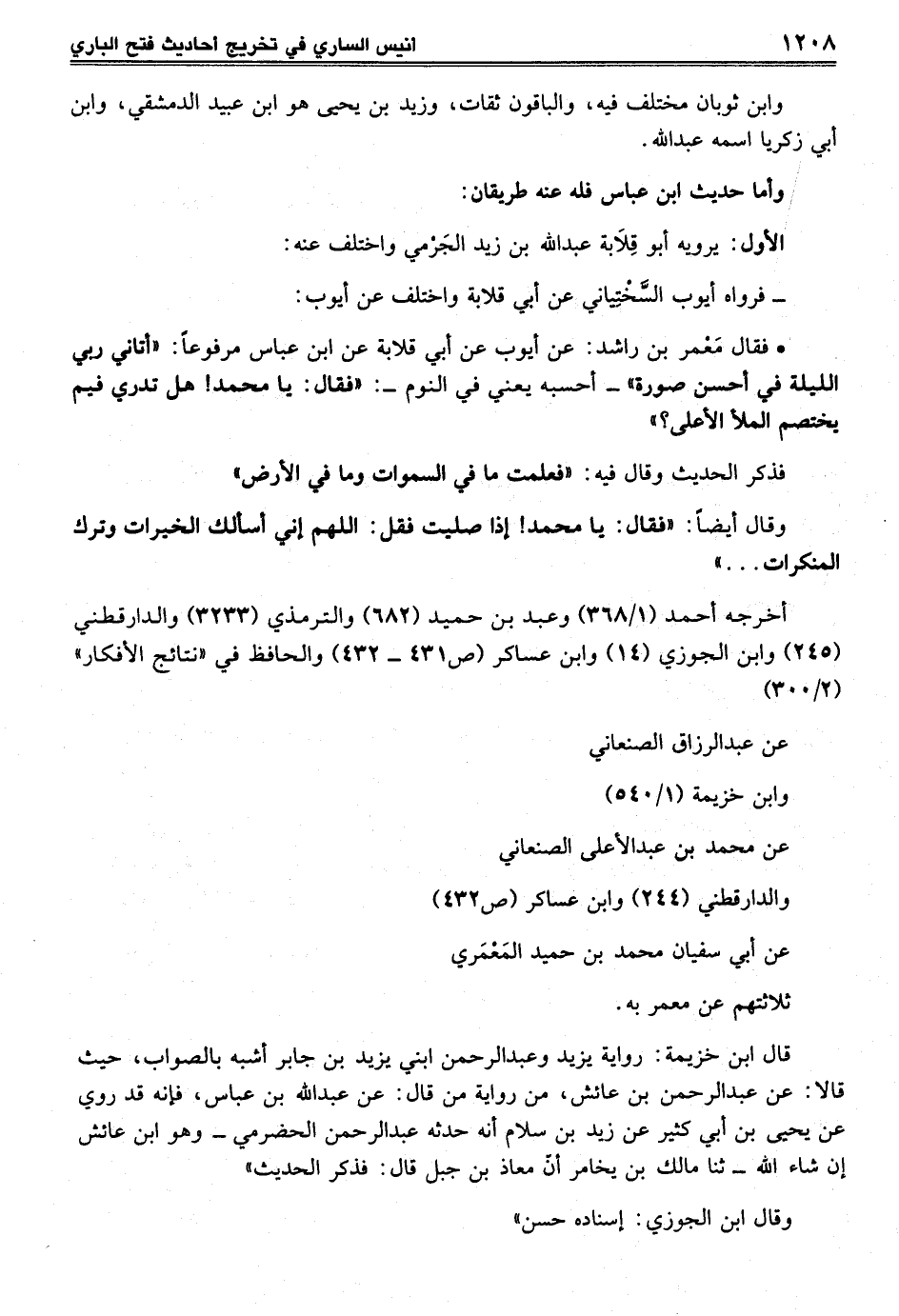 • فقال مَعْمر بن راشد: عن أيوب عن أبي قلابة عن ابن عباس مرفوعاً: "أتاني ربي الليلة ني أحسن صورة" -أحسبه يعني في النوم-: "فقال: يا محمد! هل تدري فيم بختصم الملأ الأعلى؟ "