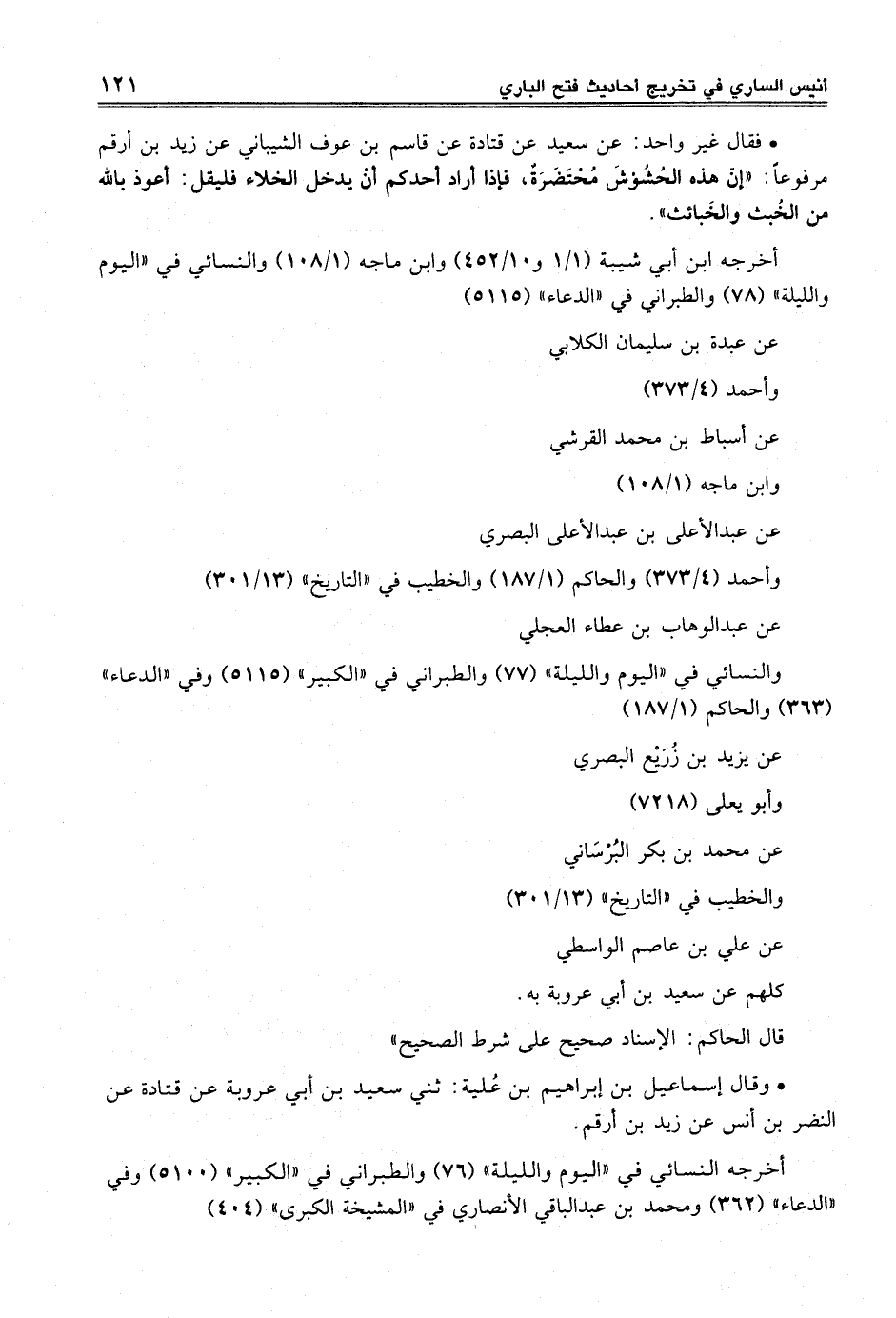 • فقال غير واحد: عن سعيد عن قتادة عن قاسم بن عوف الشيباني عن زيد بن أرقم مرفوعاً "إنّ هذه الحُشُوْشَ مُحْتَضَرَةٌ، فإذا أراد أحدكم أنْ يدخل الخلاء فليقل: أعوذ بالله من الخُبث والخَبائث".