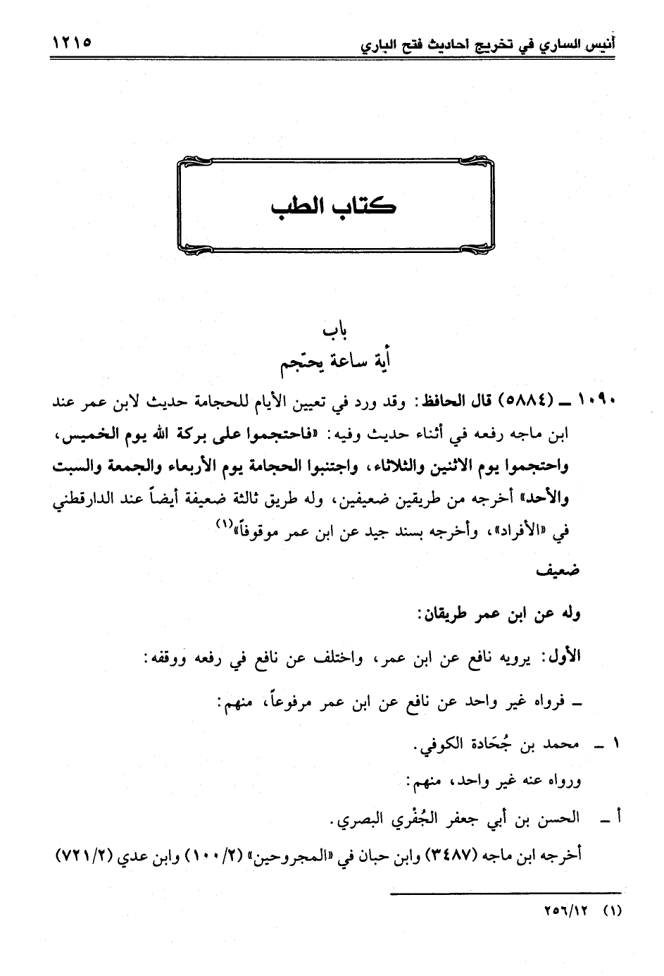 1090 - (5884) قال الحافظ: وقد ورد في تعيين الأيام للحجامة حديث لابن عمر عند ابن ماجه رفعه في أثناء حديث وفيه: "فاحتجموا على بركة الله يوم الخميس، واحتجموا يوم الاثنين والثلاثاء، واجتنبوا الحجامة يوم الأربعاء والجمعة والسبت والأحد" أخرجه من طريقين ضعيفين، وله طريق ثالثة ضيفة أيضاً عند الدارقطني في "الأفراد"، وأخرجه بسند جيد عن ابن عمر موقوفاً" (¬1)
