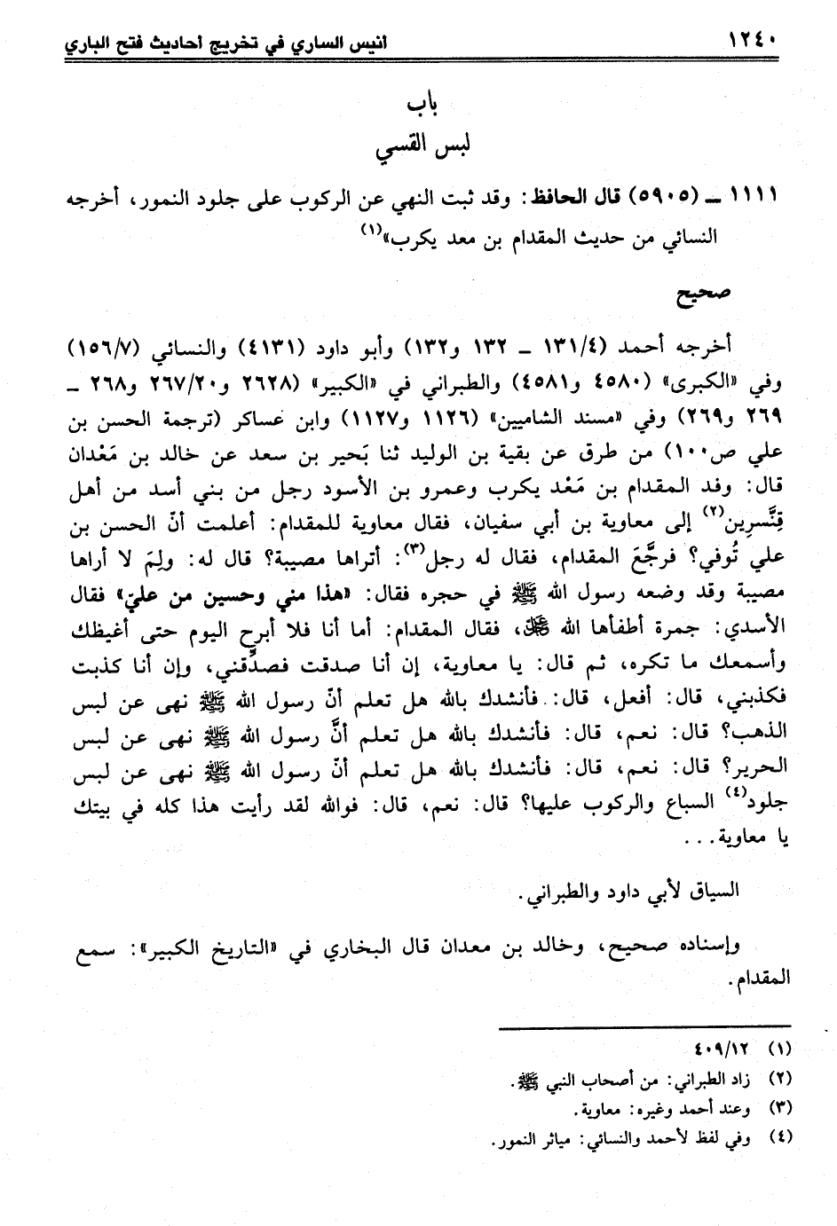 1111 - (5905) قال الحافظ: وقد ثبت النهي عن الركوب على جلود النمور، أخرجه النسائي من حديث المقدام بن معد يكرب" (¬1)