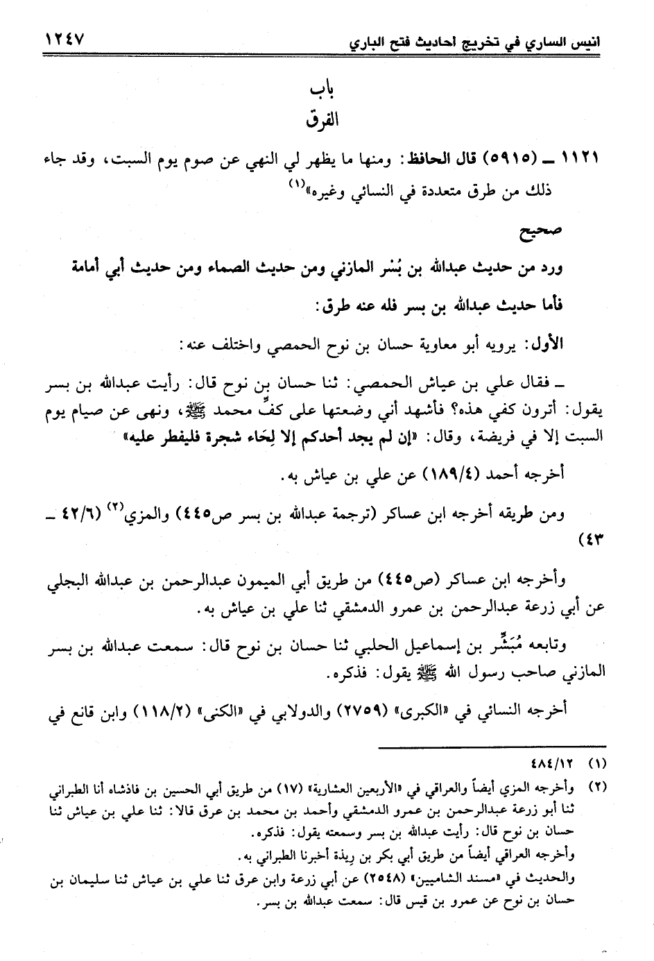 1121 - (5915) قال الحافظ: ومنها ما يظهر لي النهي عن صوم يوم السبت، وقد جاء ذلك من طرق متعددة في النسائي وغيره" (¬1)