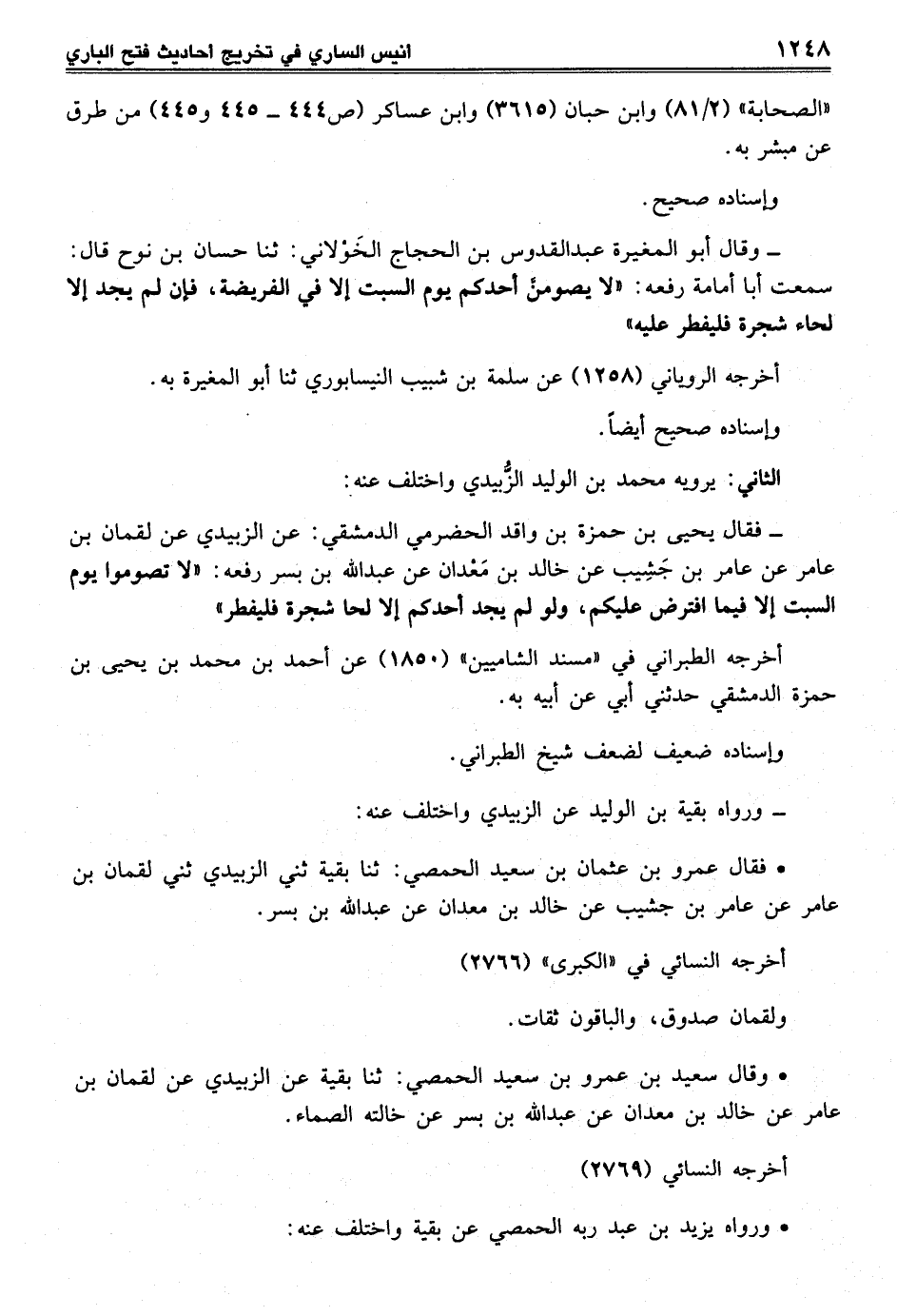- وقال أبو المغيرة عبد القدوس بن الحجاج الخَوْلاني: ثنا حسان بن نوح قال: سمعت أبا أمامة رفعه: "لا يصومنَّ أحدكم يوم السبت إلا في الفريضة، فإن لم يجد إلا لحاء شجرة فليفطر عليه"