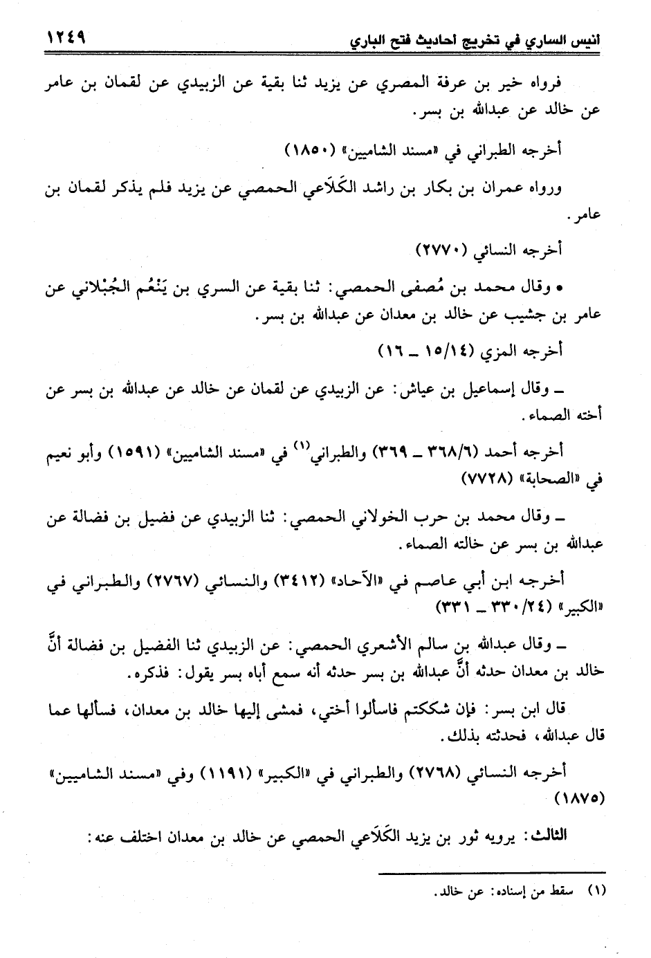 - وقال عبد الله بن سالم الأشعري الحمصي: عن الزبيدي ثنا الفضيل بن فضالة أنَّ خالد بن معدان حدثه أنَّ عبد الله بن بسر حدثه أنه سمع أباه بسر يقول: فذكره.