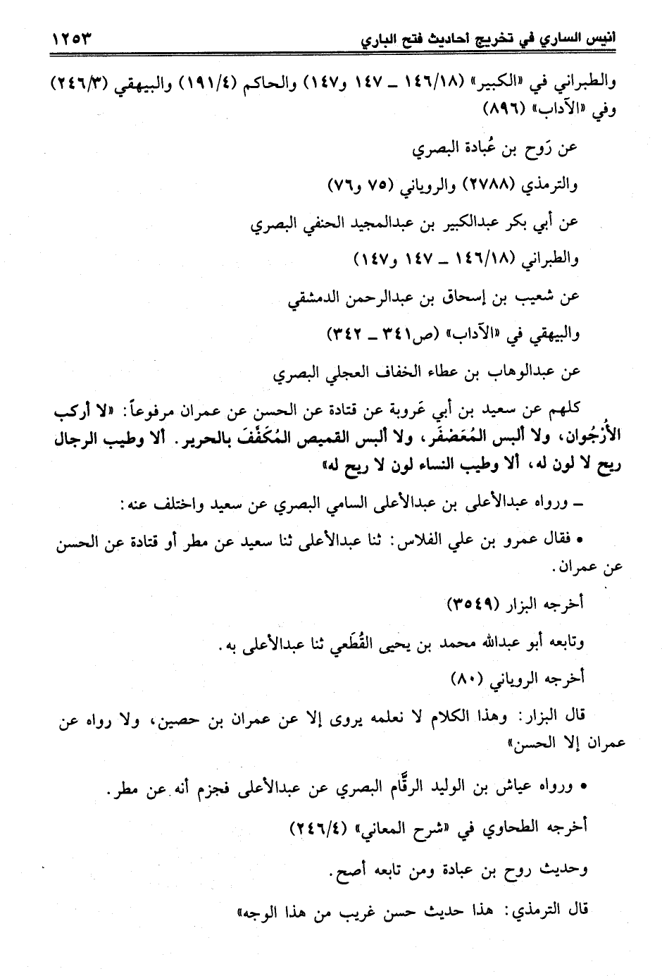 كلهم عن سعيد بن أبي عَروبة عن قتادة عن الحسن عن عمران مرفوعاً: "لا أركب الأُرْجُوان، ولا ألبس المُعَصْفَر، ولا ألبس القميص المُكفَّفَ بالحرير. ألا وطيب الرجال ريح لا لون له، ألا وطيب النساء لون لا ريح له"