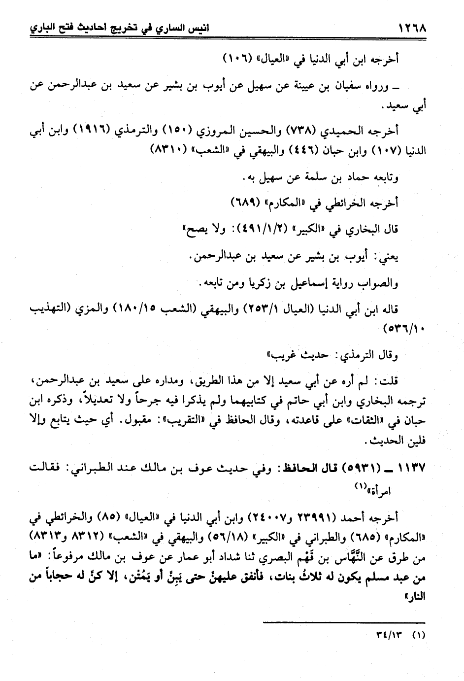 1137 - (5931) قال الحافظ: وفي حديث عوف بن مالك عند الطبراني: فقالت امرأة" (¬1) أخرجه أحمد (23991 و24007) وابن أبي الدنيا في "العيال" (85) والخرائطي في "المكارم" (685) والطبراني في "الكبير" (18/ 56) والبيهقي في "الشعب" (8312 و8313) من طرق عن النَّهَّاس بن قَهْم البصري ثنا شداد أبو عمار عن عوف بن مالك مرفوعاً: "ما من عبد مسلم يكون له ثلاثُ بنات، فأنفق عليهنَّ حتى يَبِنَّ أو يَمُتْن، إلا كنَّ له حجاباً من النار"