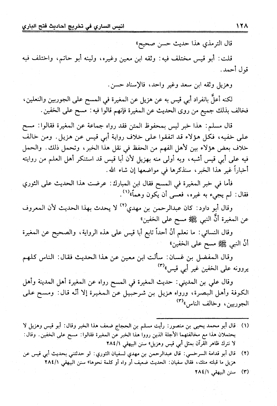 (¬1) قال أبو محمد يحيى بن منصور: رأيت مسلم بن الحجاج ضعف هذا الخبر وقال: أبو قيس وهزيل لا يحتملان هذا مع مخالقهما الأجلة الذين رووا هذا الخبر عن المغيرة فقالوا: مسح على الخفين. وقال: لا نترك ظاهر القرآن بمثل أبي قيس وهزيل" سنن البيهقي 1/ 284