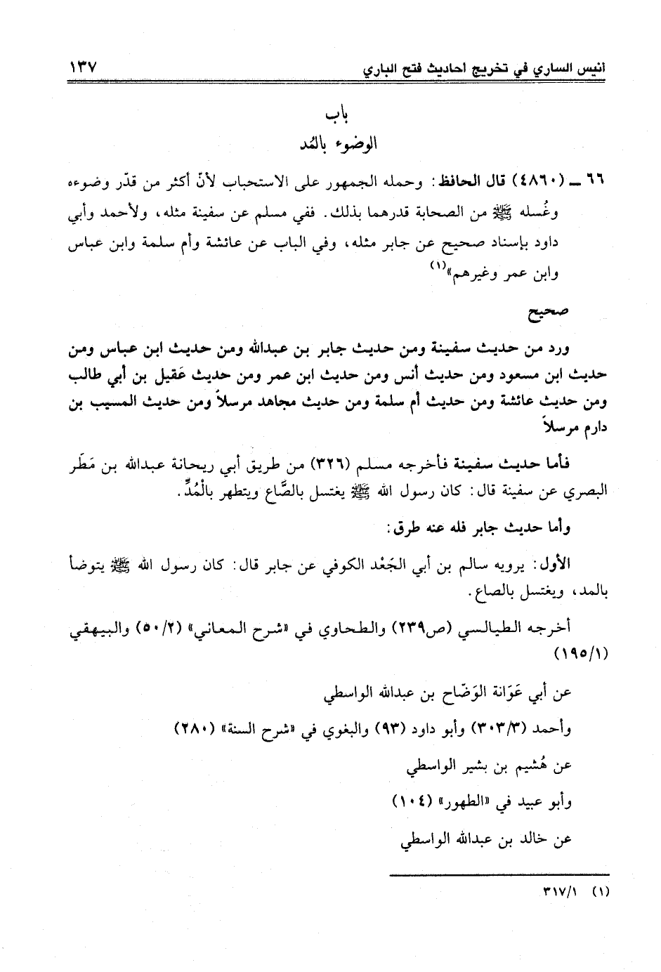 66 - (4860) قال الحافظ: وحمله الجمهور على الاستحباب لأنّ أكثر من قدّر وضوءه وغُسله -صلى الله عليه وسلم- من الصحابة قدرهما بذلك. ففي مسلم عن سفينة مثله، ولأحمد وأبي داود بإسناد صحيح عن جابر مثله، وفي الباب عن عائشة وأم سلمة وابن عباس وابن عمر وغيرهم" (¬1)