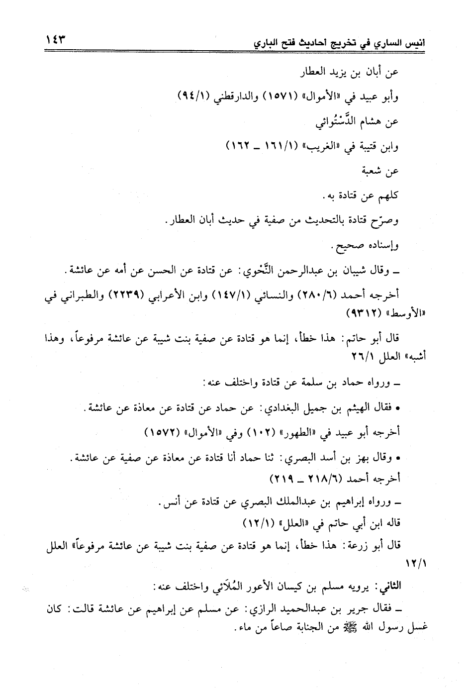 قال أبو حاتم: هذا خطأ، إنما هو قتادة عن صفية بنت شيبة عن عائشة مرفوعاً، وهذا أشبه" العلل 1/ 26